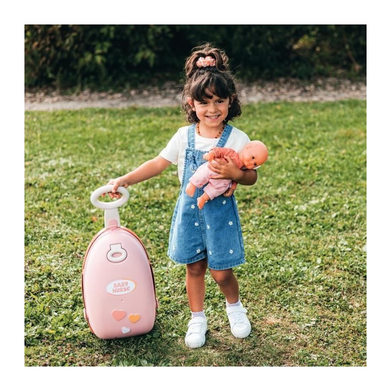 Avec la valise nurserie 3 en 1 Baby Nurse votre enfant pourra amener son poupon partout avec lui ! Tres complete, la valise possede un coin nuit, un coin repas et des rangements. Elle peut etre utilisée comme valise, chaise haute mais également comme lit. Votre petit pourra installer son bébé sur le siege repas de la tablette escamotable pour lui donner a manger. 1 assiette, 1 cuillere et 1 biberon sont inclus. Apres le repas, bébé pourra se reposer. Il suffira a votre enfant d'ouvrir la valise pour voir apparaître le coin nuit : 1 lit avec un drap et des rideaux sont inclus pour faire une bonne sieste ! Trois étageres lui permettront de ranger ses accessoires. La valise nurserie vous suivra partout car c'est un produit nomade facile a plier et a transporter grâce aux roulettes ! 6 accessoires sont inclus : 1 biberon, 1 assiette, 1 cuillere, 2 cintres et 1 drap.Pour poupons rter grâce aux roulettes ! 6 accessoires sont inclus : 1 biberon, 1 assiette, 1 cuillere, 2 cintres et 1 drap. Pour poupons jusqu'a 42cm - Poupon non inclus. A partir de 18 mois. Fabrication française.