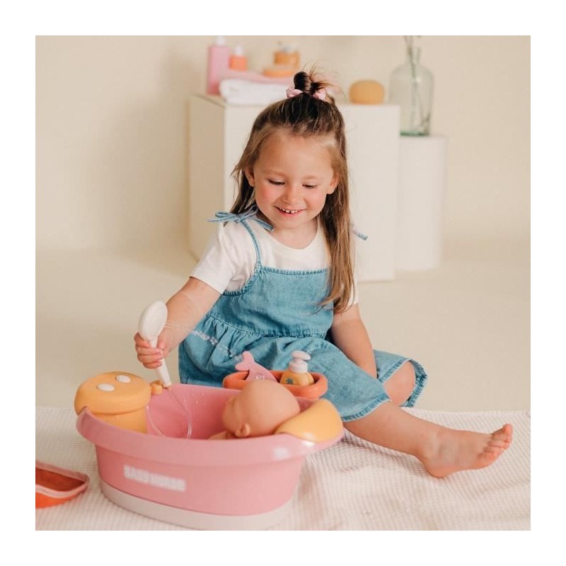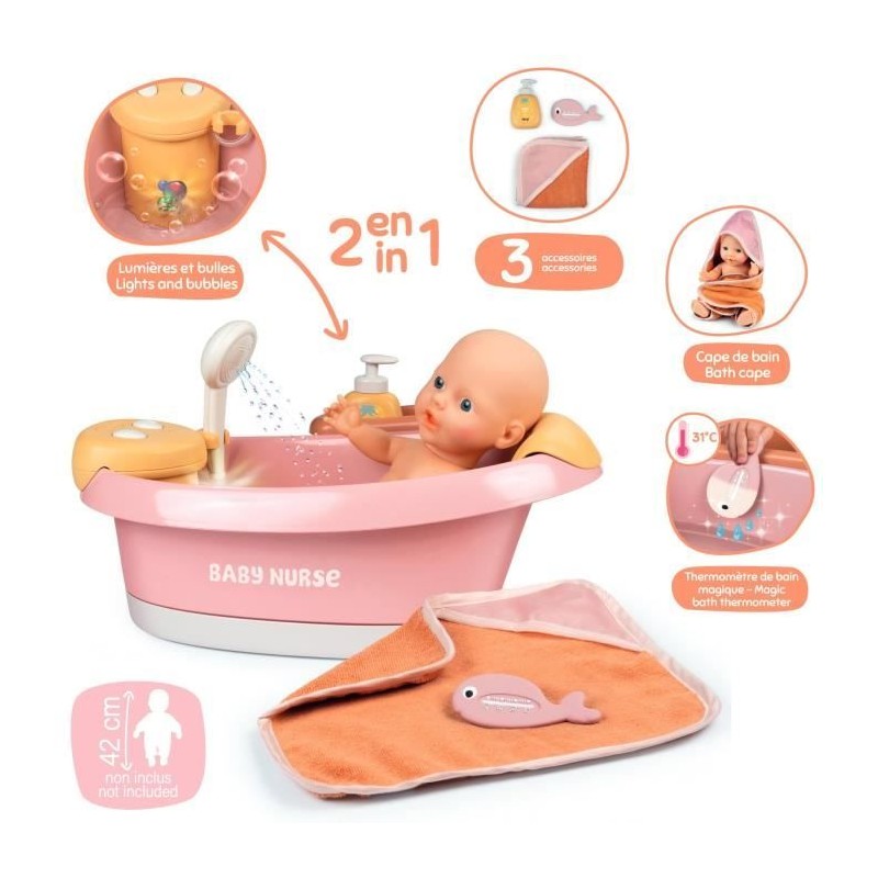 Avec la baignoire balnéo Baby Nurse, votre enfant pourra prendre soin de son poupon ! La baignoire est composée d'un module électronique avec 2 fonctions. Remplissez-la d'eau et votre petit pourra alors s'amuser avec les jets d'eau et les bulles ! En plus, des lumieres LED de différentes couleurs s'éclairent lors du jeu ! Un bac de rangement, un repose-tete, une douchette fonctionnelle (circuit fermé) et divers accessoires sont inclus pour agrémenter les fonctions de jeu : cape de bain matiere éponge, pousse-mousse gel douche avec action mécanique, thermometre baleine thermosensible (il change de couleur et devient rose au contact de l'eau).3 piles LR03 non incluses. Pour poupons jusqu'a 42cms. Poupon non inclus. A partir de 3 ans.