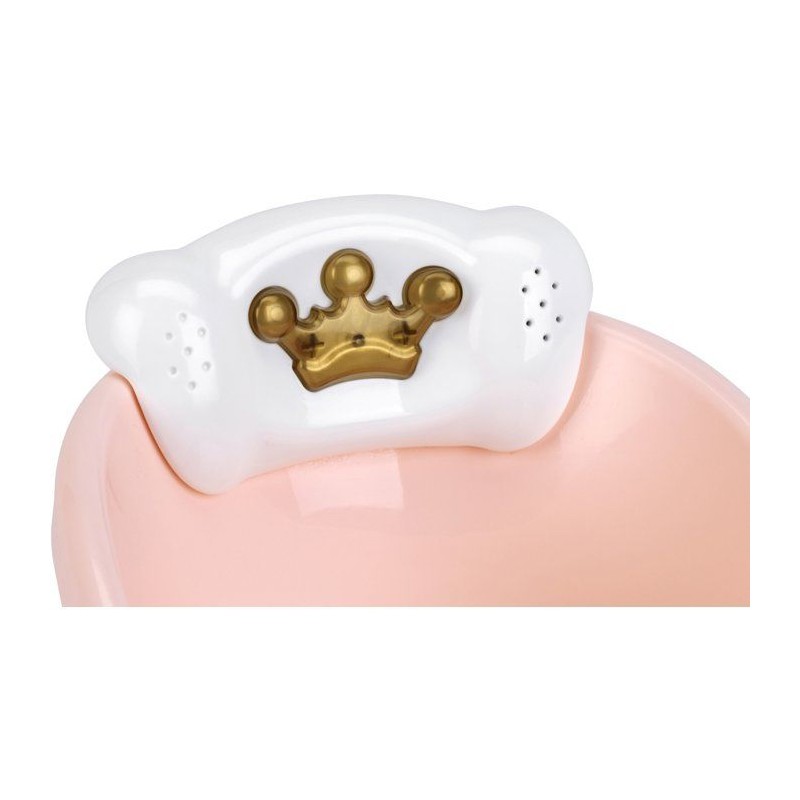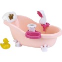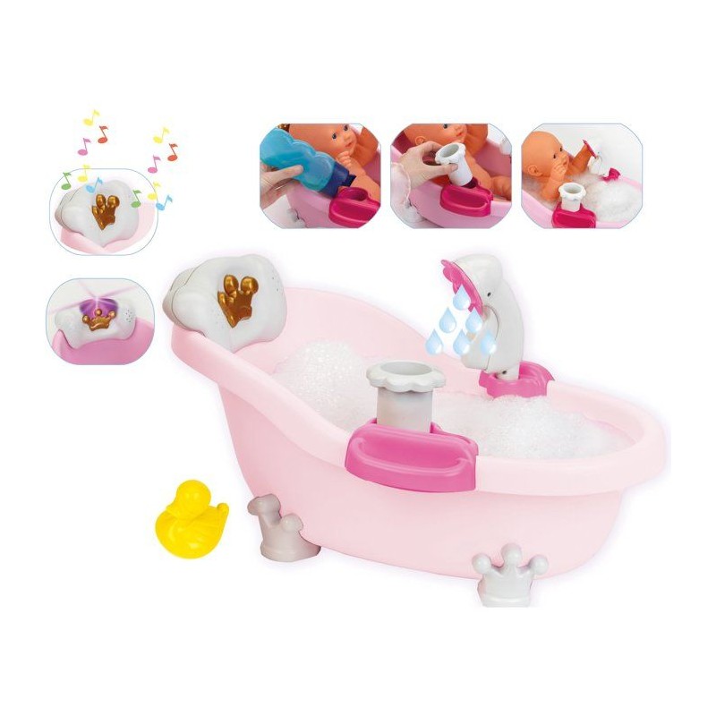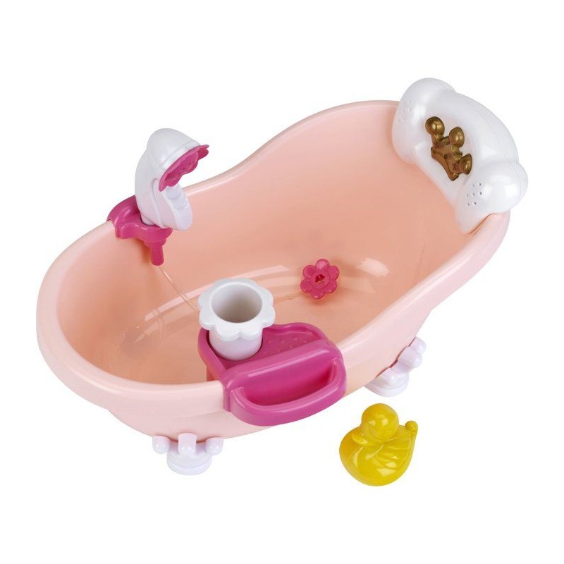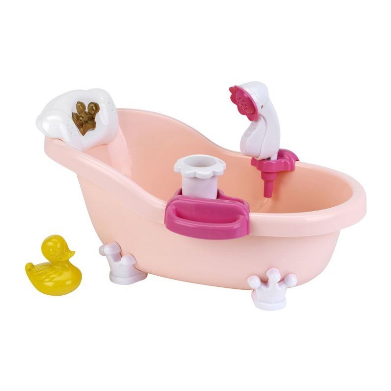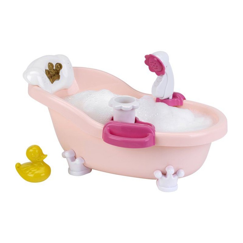 C'est l'heure du bain ! Avec cette ravissante baignoire les enfants vont adorer baigner leur poupée. Avec ses fonctions lumineuses et sonores déclenchées en en appuyant sur la petite couronne dorée, le bain devient un vrai moment de détente. Si l'on met un peu de bain moussant et d'eau dans la baignoire, elle fait aussi des bulles quand on appuye sur la pompe en forme de fleur, et la douchette permet de rincer bébé. Dimensions de la baignoire : 42 x 23 x 23 cm. Convient aux enfants a partir de 18 mois. Piles non fournies : 3 x R03-AAA.