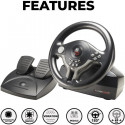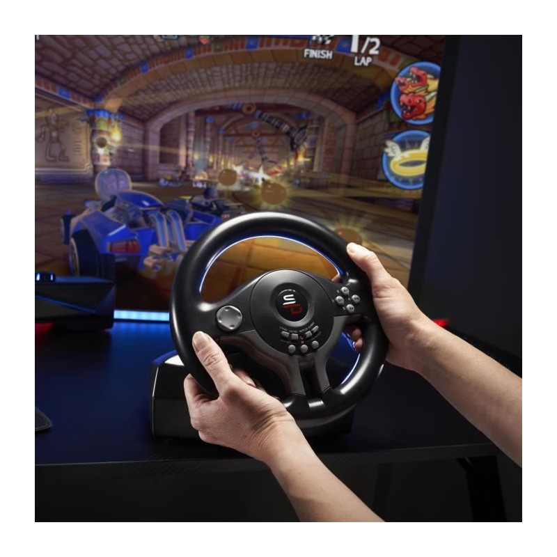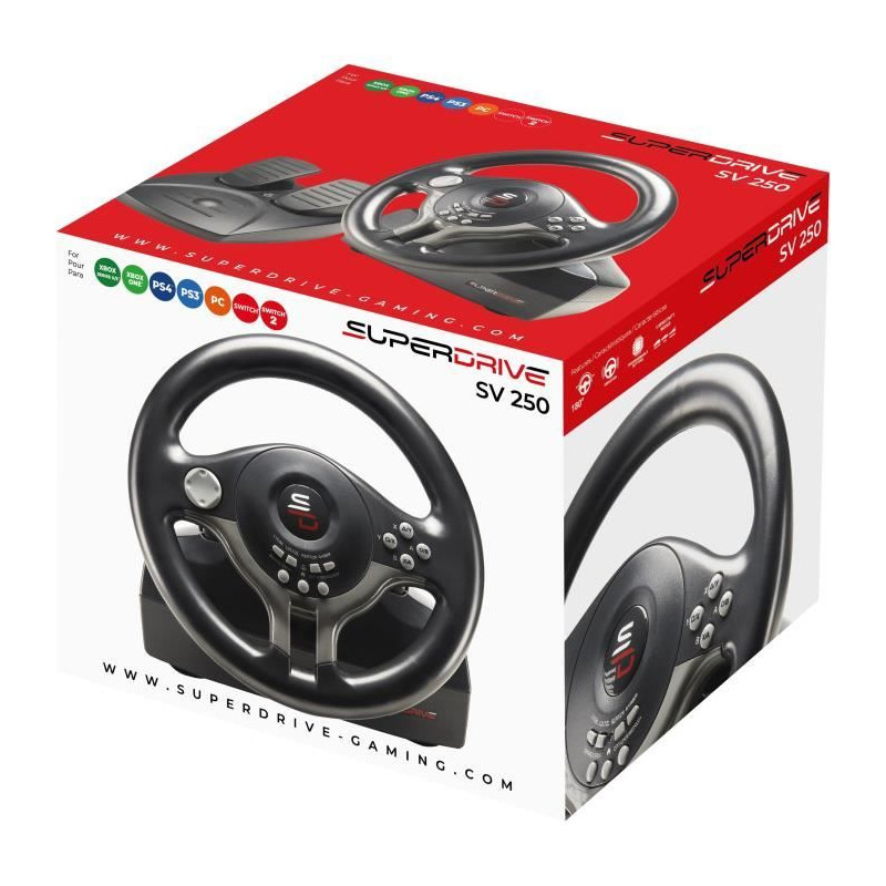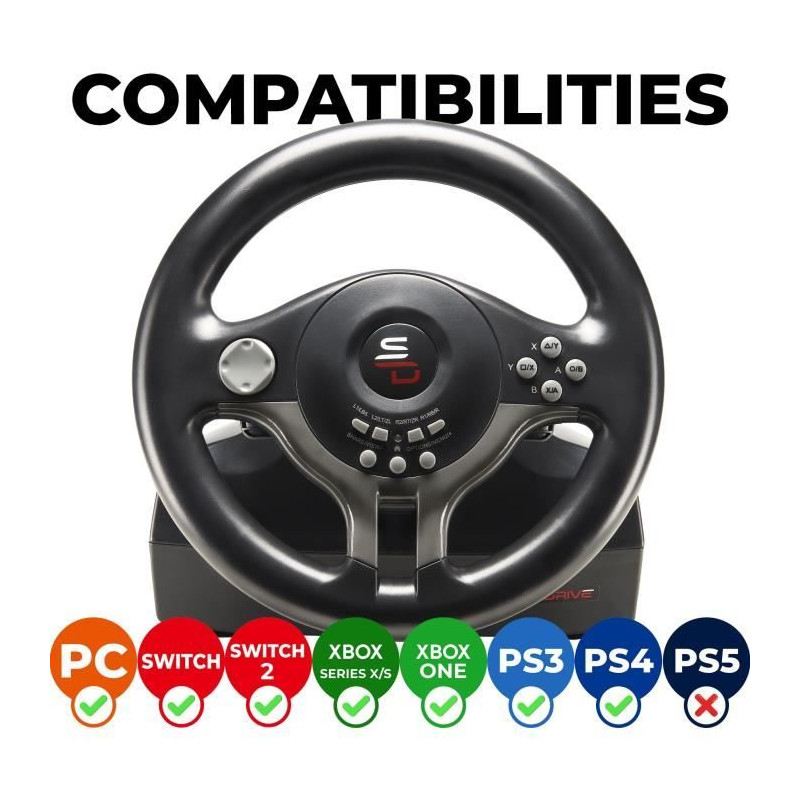 Volant compatible Switch 2, Switch, Xbox Serie X/S, PS4, Xbox One et PC. Double moteur de vibration. Palettes de changement de vitesses. Pédalier avec pédales d'accélération et de frein, et patins antiglisse pour une stabilité optimale. Palettes de changement de vitesse +/-. Remplace intégralement la manette : navigation dans les menus via la croix directionnelle et les boutons sur le volant. Angle de rotation 180°. Réglage de la sensibilité (3 niveaux de sensibilité). Se fixe sur un bureau grâce a ses ventouses. Boutons reprogrammables pour s'adapter a tous les types de jeu. Se branche directement sur la manette. 100% compatible avec tous les jeux de course sur Switch, PS4, Xbox et PC (Mario Kart World, Gran Turismo 7, Forza Motor Sport 7, Forza Horizon 5, Project Cars 2, F1 26, Need for Speed, Dirt, WRC, Grid, V Rally 4, Gear Club 2... et meme GTA V etc.). N'est pas compatible PS5.