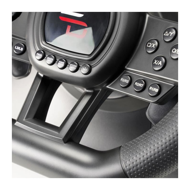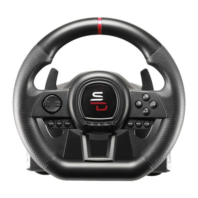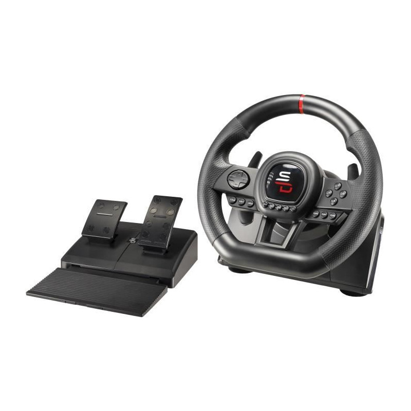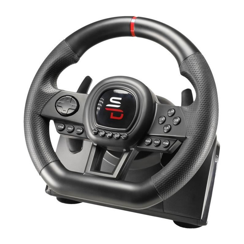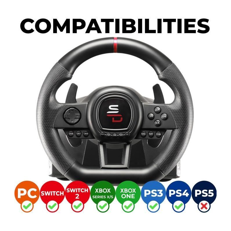 Volant compatible Switch 2, Switch, Xbox Serie X/S, PS4, Xbox One et PC. Double moteur de vibration. Palettes de changement de vitesses. Pédalier avec pédales d'accélération et de frein, et patins antiglisse pour une stabilité optimale. Palettes de changement de vitesse +/-. Remplace intégralement la manette : navigation dans les menus via la croix directionnelle et les boutons sur le volant. Angle de rotation 270°. Réglage de la sensibilité (3 niveaux de sensibilité). Se fixe sur un bureau grâce a ses ventouses. Boutons reprogrammables pour s'adapter a tous les types de jeu. Se branche directement sur la manette. 100% compatible avec tous les jeux de course sur Switch, PS4, Xbox et PC (Mario Kart World, Gran Turismo 7, Forza Motor Sport 7, Forza Horizon 5, Project Cars 2, F1 26, Need for Speed, Dirt, WRC, Grid, V Rally 4, Gear Club 2... et meme GTA V etc.). N'est pas compatible PS5.
