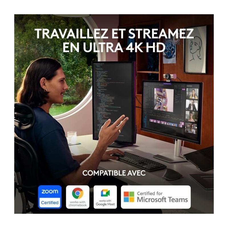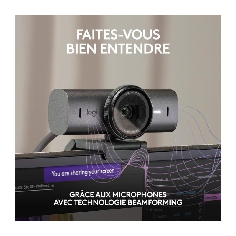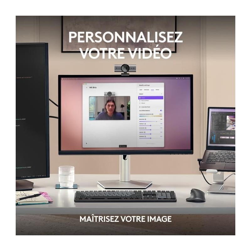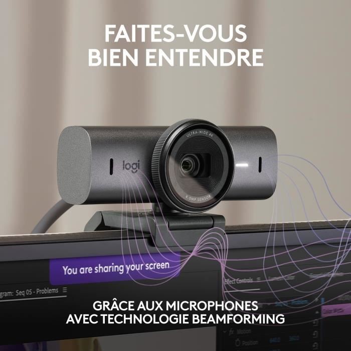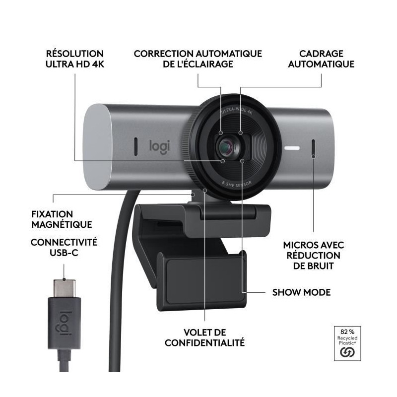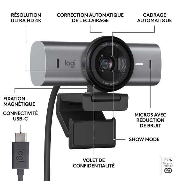 Échangez et maîtrisez votre travail avec la webcam Logitech MX Brio Ultra HD 4K pour la collaboration et le streaming. Découvrez une résolution vidéo Ultra HD 4k parfaitement nette avec l'amélioration de l'image par l'IA, notre objectif conçu en interne et notre capteur le plus avancé a ce jour avec des pixels 70% plus larges pour une visibilité du visage 2 fois supérieure et des détails 2 fois plus fins dans des conditions d'éclairage difficiles. Les commandes précises de cette webcam Ultra HD vous permettent de régler finement l'éclairage et la balance des blancs avec la sensibilité ISO, la vitesse de l'obturateur, la teinte et la vibrance. Les deux microphones omnidirectionnels réduisent le bruit de fond pour que vous puissiez etre clairement entendu grâce a une technologie dédiée. Show Mode vous permet de montrer vos productions et vos notes lors d'appels vidéo en inclinant la caméra vers le bas.