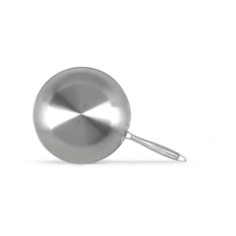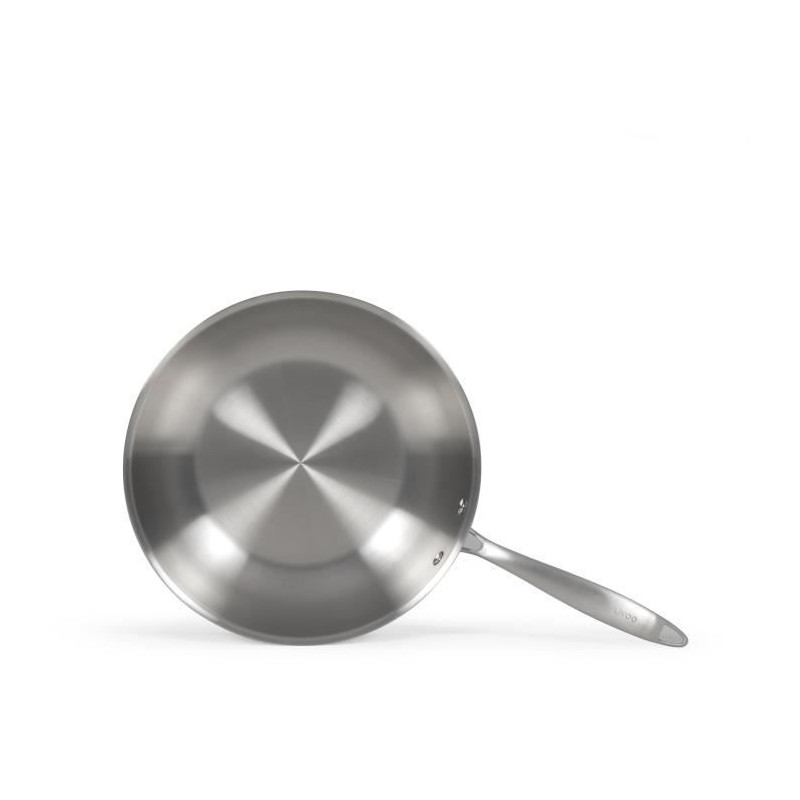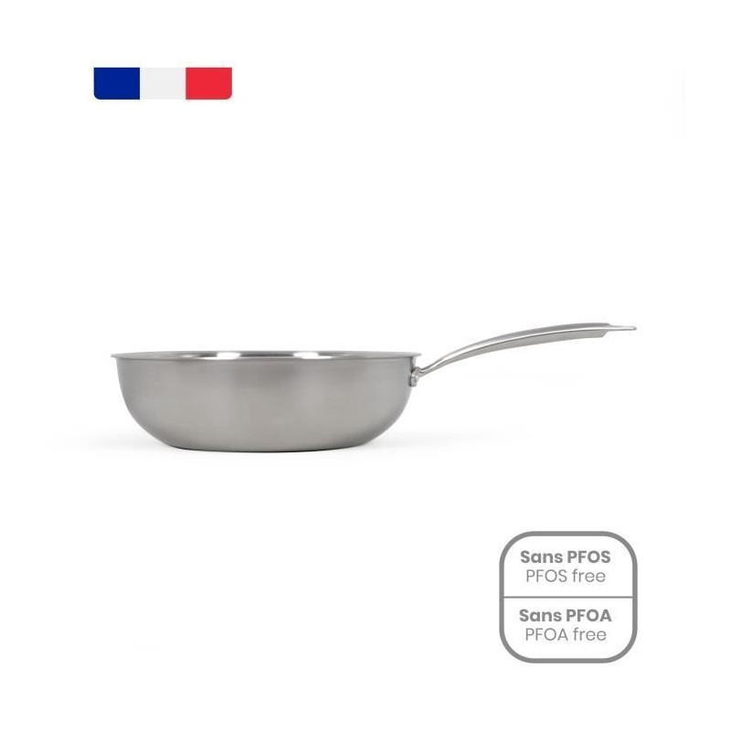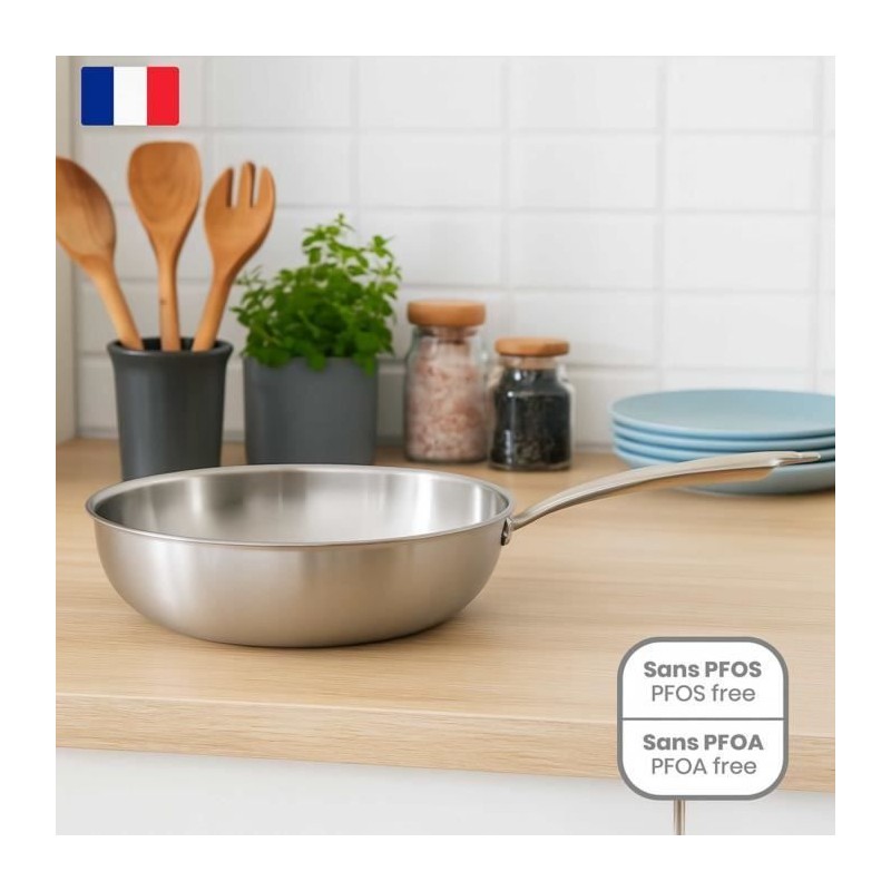 La poele idéale pour une cuisson saine et performante, fabriquée en France. Ø 28 cm, épaisseur 2,3 mm. Inox 3 plis pour une diffusion homogene de la chaleur. Sans PFOA ni PFOS. Manche riveté, compatible tous feux dont induction et four. Passe au lave-vaisselle.