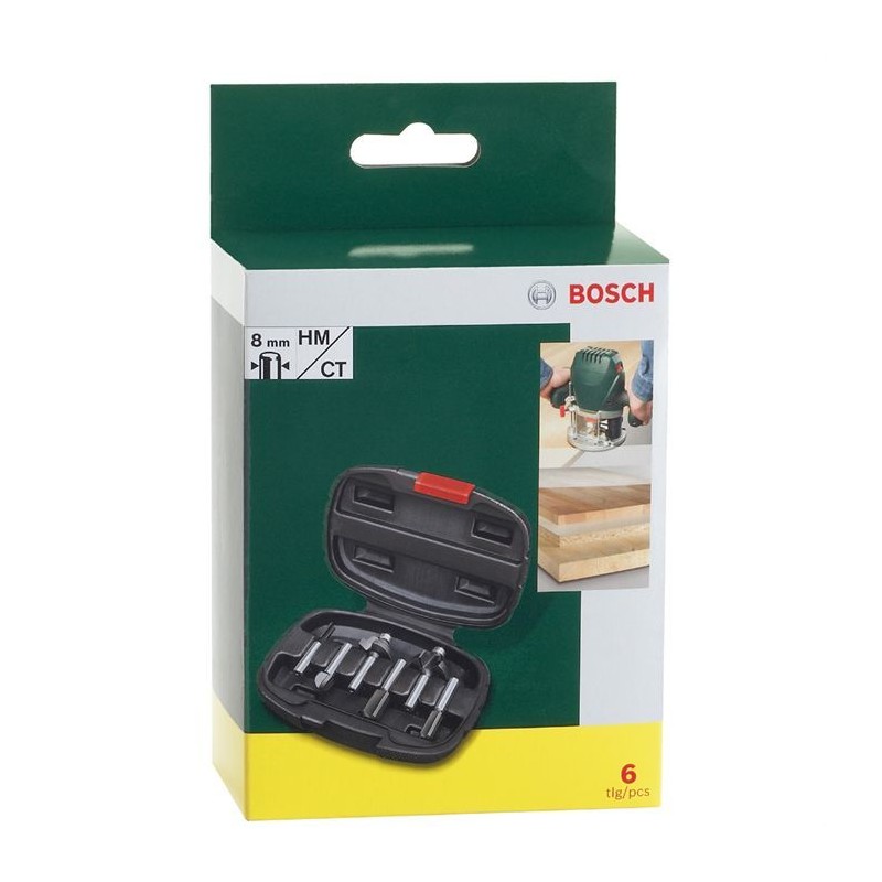 BOSCH box comprising 6 cutters - Material: carbide - Diameter: 8mm - Type of milling cutters: 2 to groove straight, 1 to groove, 1 to round with ball bearing, 1 to dovetail and 1 to profile with ball bearing - Thick tungsten carbide insert - Applications: solid wood, composite wood and synthetic materials.