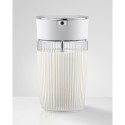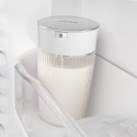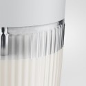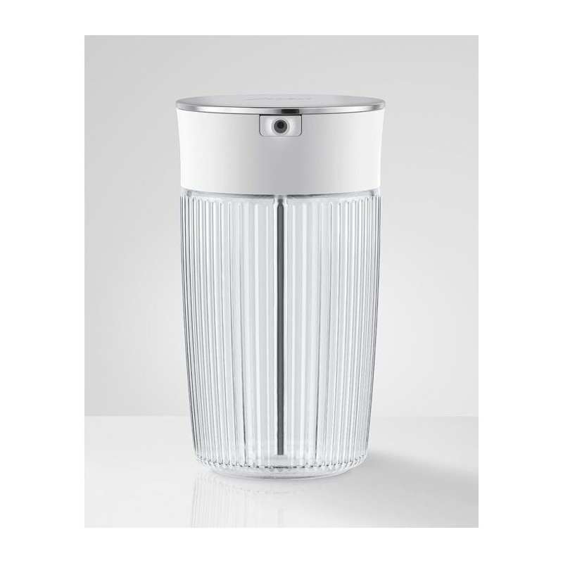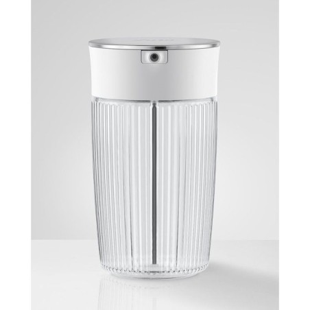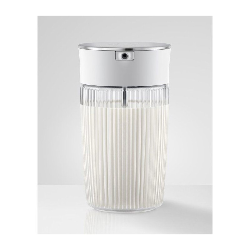 Cette carafe a lait en verre strié, équipée d'adaptateurs silicone et d'un couvercle pivotant, combine esthétique, praticité et compatibilité avec boissons végétales.
