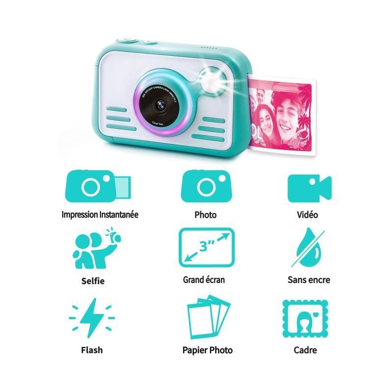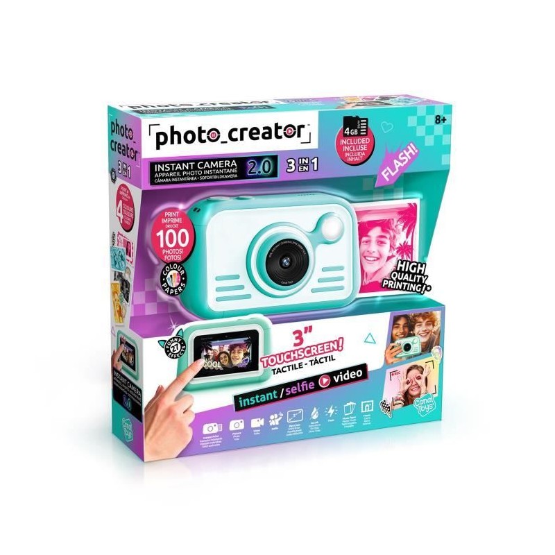 Un appareil photo innovant et tendance avec un écran tactile HD de 3'' qui imprime sur papier photo ! Prends des photos et vidéos, et imprime instantanément en haute qualité et en 4 couleurs différentes ! Imprime 100 photos ! Carte SD 4Go incluse.