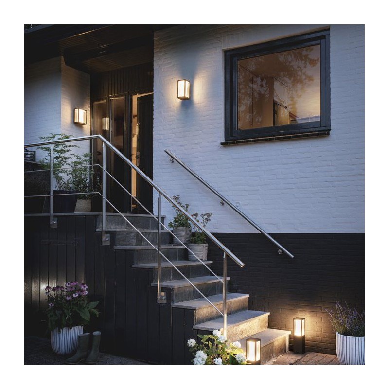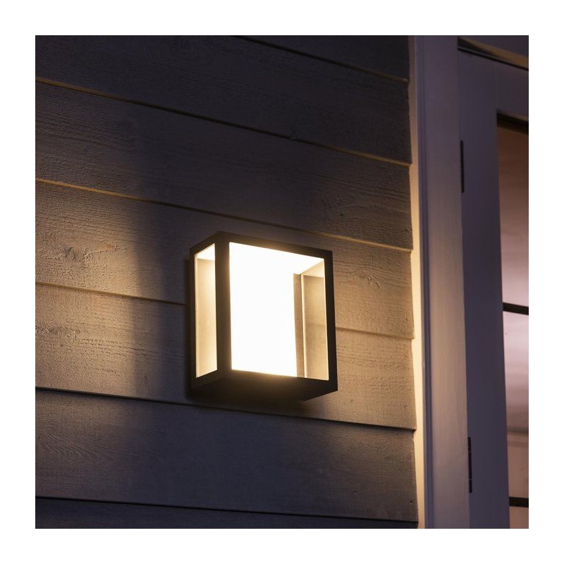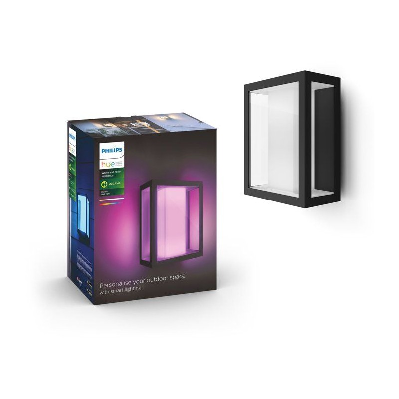 Avec sa forme élégante, l'applique murale noire Philips Hue Impress ajoute un bel élément décoratif a une maison moderne. La lampe LED White and color ambiance, placée derriere des carreaux de verre, peut embellir votre jardin ou votre façade avec une palette de 16 millions de couleurs. Toute une série de fonctionnalités d'éclairage intelligent sont accessibles en connectant la lampe a un Bridge Hue. Vous apprécierez les fonctions utiles comme les minuteurs ou le geofencing, qui allume automatiquement la lampe lorsque vous vous approchez de votre domicile. Via le Bridge, vous contrôlez facilement la lampe avec l'appli Philips Hue sur votre smartphone ou votre tablette. L'applique est résistante aux intempéries grâce a son indice IP44. Pas de souci a se faire en cas de pluie ou de vent.