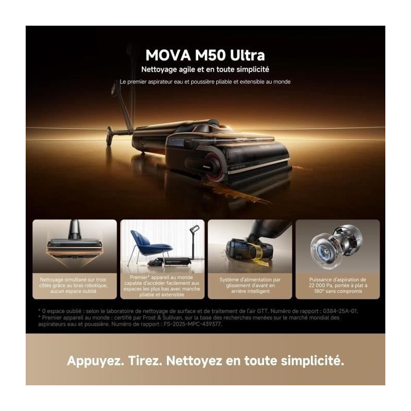 MOVA M50 ULTRA - Aspirateur Balai Laveur - 22 000 Pa - Bras robotisé - Poignée Pliable et Extensible - Lavage Brosse immersif