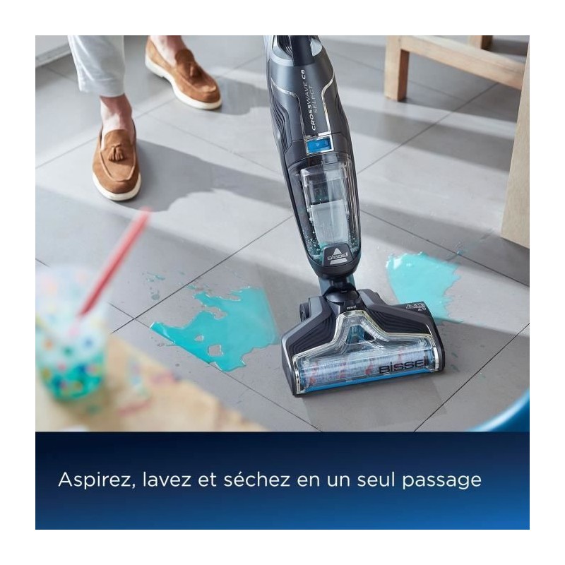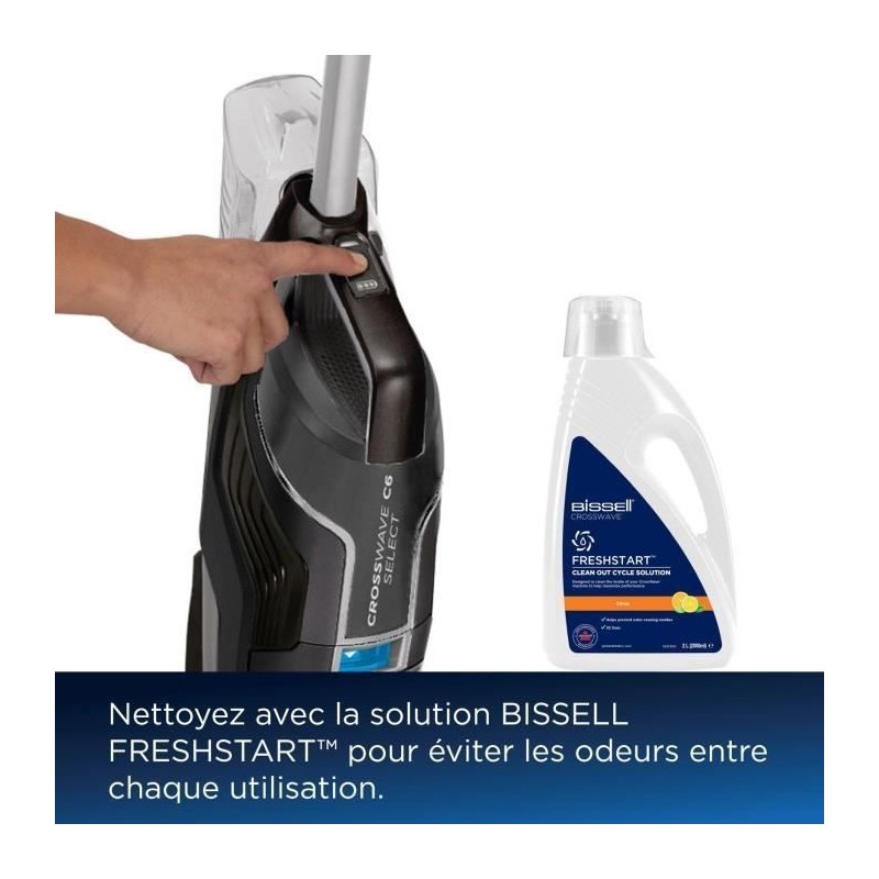 Découvrez le nettoyeur sans fil 3 en 1 BISSELL B3569N Crosswave C6 Select. Il lave, aspire et seche simultanément avec la fonction de gestion des odeurs FRESHSTART. Profitez d'un cycle d'auto-nettoyage complet. Batterie Lithium-Ion, collecte des poussieres sans sac, capacité du collecteur de 0,62 l. Outils inclus : brosse multi-surface, filtres anti-microbiens, 2 détergents.
