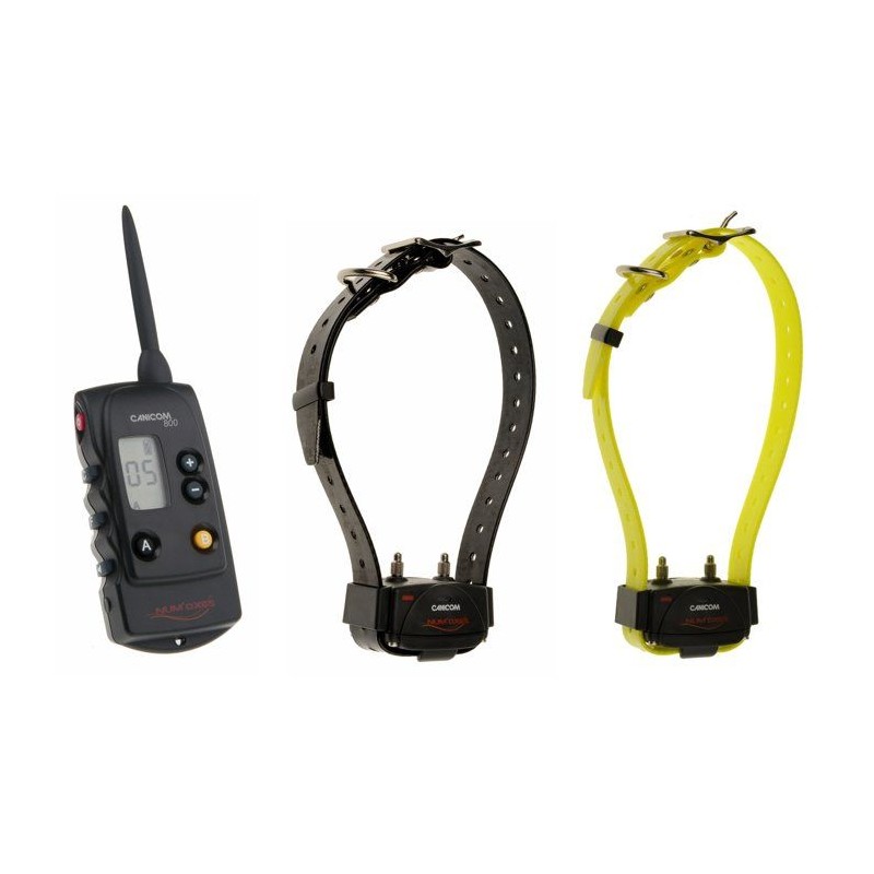PACK CANICOM 800 2 CHIENS 1 télécommande Canicom 800 + 1 collier Canicom sangle noire + 1 collier Canicom sangle jaune + piles et accessoires + mallette de transport Le collier de rappel pour chien Canicom 800 conviendra parfaitement pour corriger les mauvaises habitudes de votre chien. Il vous permettra de travailler jusqu'a une portée de 800 metres en fonction de la nature du terrain.