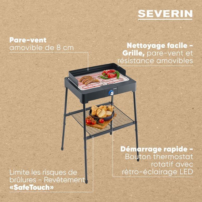 Le barbecue SEVERIN PG8566 est un modele 2-en-1 utilisable sur pieds ou en table. SafeTouch pour un corps froid au toucher. Cuve a eau limitant fumées et odeurs. Chauffe rapide, thermostat réglable et grille inox durable. Appareil démontable facilitant le nettoyage. Parfait intérieur/extérieur.