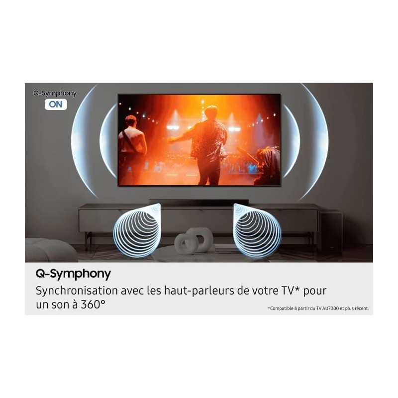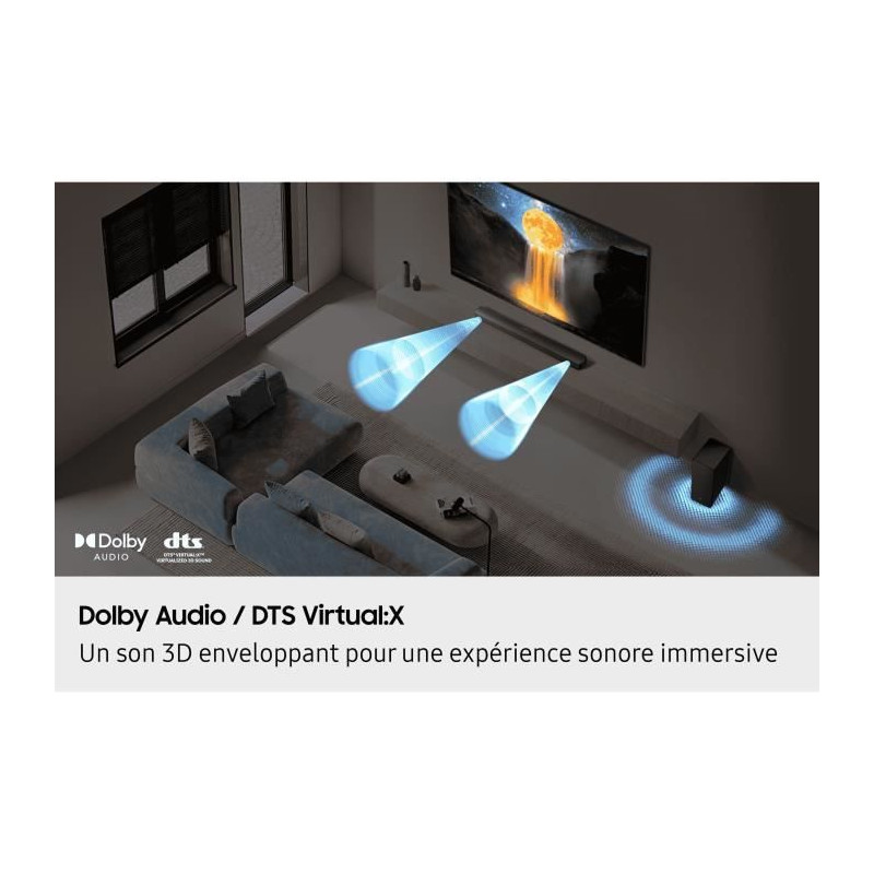 Pensée pour les passionnés de divertissement, cette barre de son 3.1 canaux offre un son clair et dynamique. Grâce au haut-parleur central, au mode Jeu, au Bass Boost et a la technologie DTS Virtual:X, chaque scene prend vie. HDMI ARC et Q-Symphony assurent une intégration parfaite avec votre téléviseur.
