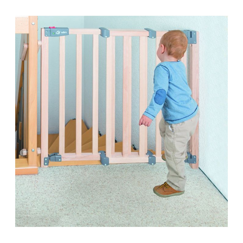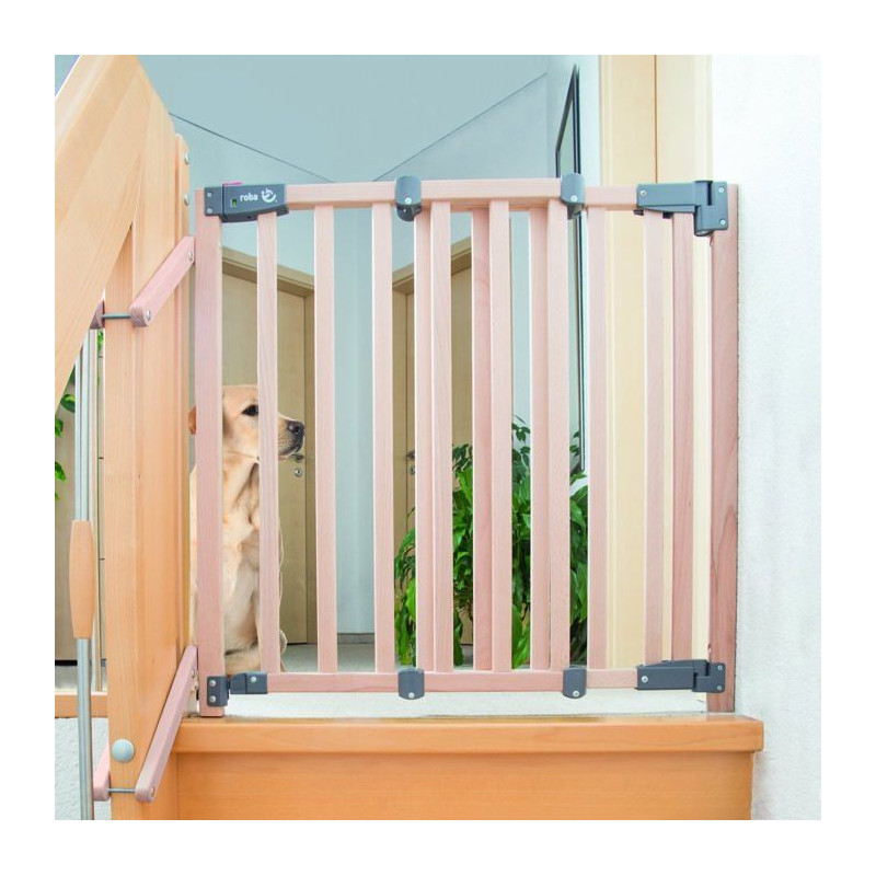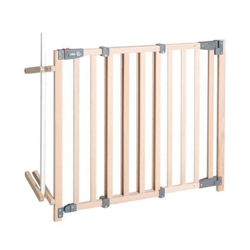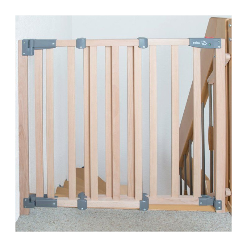 Roba Safety Up säkerhetsgrind skyddar effektivt ditt barn från trappor. Den är tillverkad av massivt bokträ och är justerbar från 93,5 till 120,5 cm. Med en praktisk dörr som öppnas lätt i en riktning stängs den automatiskt med ett magnetlås med visuell kontroll. Installationen är enkel genom att skruva.