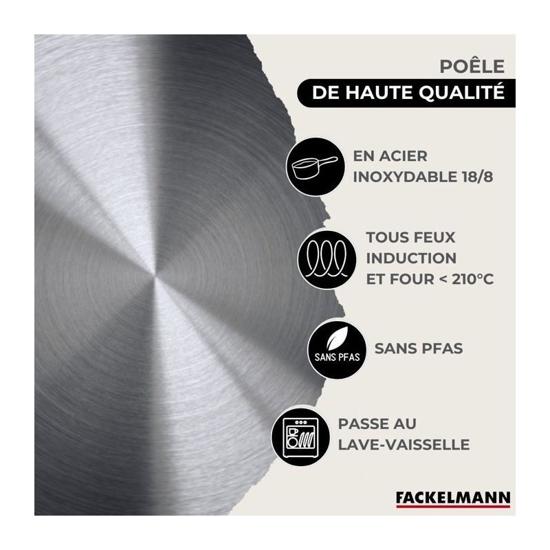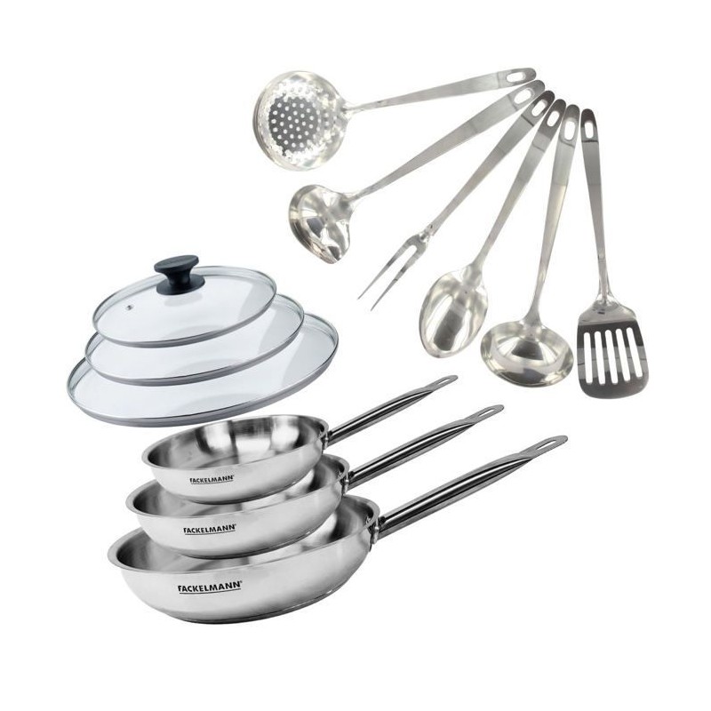 DESCRIPTION: Batterie de cuisine Fackelmann Eterna de 3 poeles de 20, 24, 28 cm en inox 18/8, 3 couvercles en verre, et 6 ustensiles de cuisine et de service inoxPETIT +: Ce set permet une cuisson saine, pratique et qualitative pour 1 a 5 personnesCOMPOSITION: Poele en inox 18/8, couvercles en verre avec rebord en inox 18/10, ustensiles en inox, tous résistants et de haute qualitéDIMENSIONS: Poele 20 cm Hauteur 4,5 cm Fond 14,5 cm Manche 16,5 cm Poele 24 cm Hauteur 5,5 cm Fond 18,5 cm Manche 19 cm Poele 28 cm Hauteur 5,5 cm Fond 20 cm Manche 19 cm Couvercles 20 24 et 28 cm ustensiles 28 a 32 cmUTILISATION: Les poeles conviennent a tous types de feux, les couvercles permettent une cuisson maîtrisée, les ustensiles facilitent la préparation et le serviceENTRETIEN: Poeles garanties 3 ans, compatibles lave-vaisselle, culottage nécessaire avant la premiere utilisation couvercles et ustensiles a laver a la mainCes poeles a frire en inox 18/8 sans PFAS de haute qualité, avec un noyau en aluminium léger, assurent une cuisson saine, une excellente conduction thermique et une répartition homogene de la chaleur. Résistantes aux rayures, elles sont tous feux dont induction et four jusqu'a 200°C. Leur couvercle en verre permet de surveiller vos plats sans ouvrir, conservant chaleur, humidité et saveurs, et leur manche tube en inox riveté offre une prise en main solide et sécurisée.Les 6 ustensiles en acier inoxydable louche, louche ovale, cuillere de service, écumoire, fourchette a viande, pelle de service sont élégants, multifonctions et robustes.Les poeles de cuisson nécessitent un culottage avant la premiere utilisation. Garanties 3 ans, passent au lave-vaisselle. Lavage a la main pour le couvercle et les ustensiles.Induction : le diametre du fond du récipient doit est égal au diametre de la zone de cuisson, sinon la plaque peut ne pas le reconnaître.