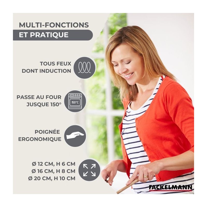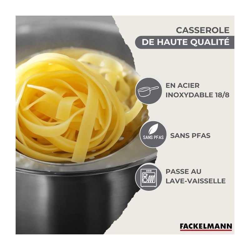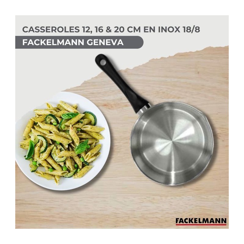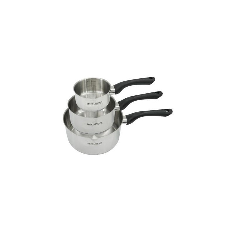 DESCRIPTION: Set de casseroles Fackelmann Geneva en inox 18/8 de 12 cm, 16 cm et 20 cm, parfaites pour sauces et plats variés pour 1 a 4 personnesPETIT +: Manche ergonomique en bakélite, échelle de mesure intégrée pour des recettes précises et bec verseurCOMPOSITION: Fabriquées en acier inoxydable 18/8, ces casseroles sont robustes et résistantes a la corrosion, sans PFASDIMENSIONS: Casserole 12 cm Hauteur 6,5 cm Fond 10,8 cm Manche 15,5 cm Casserole 16 cm Hauteur 8,5 cm Fond 14,5 cm Manche 18 cm Casserole 20 cm Hauteur 10,5 cm Fond 18,3 cm Manche 18 cmUTILISATION: Compatibles tous feux, y compris induction, et peuvent etre utilisées au four jusqu'a 150°CENTRETIEN: Faciles a entretenir, elles passent au lave-vaisselle culottage recommandé avant la premiere utilisationL'ensemble de casseroles Fackelmann Geneva comprend trois tailles pratiques pour préparer sauces et plats pour 1 a 4 personnes. En acier inoxydable 18/8 sans PFAS de haute qualité, ce sont les ustensiles parfaits pour une cuisine saine et pratique. Polyvalentes, elles sont compatibles avec tous les types de feux, y compris induction, et résistantes au four jusqu'a 150°C.Le bec verseur et l'échelle de mesure intégrée facilitent le service et la préparation précise de vos recettes. Design élégant et manche ergonomique en bakélite pour une prise en main confortable. Passent au lave-vaisselle.Culottage recommandé avant la premiere utilisation. Induction : le diametre du fond du récipient doit est égal au diametre de la zone de cuisson, sinon la plaque peut ne pas le reconnaître.