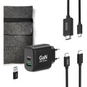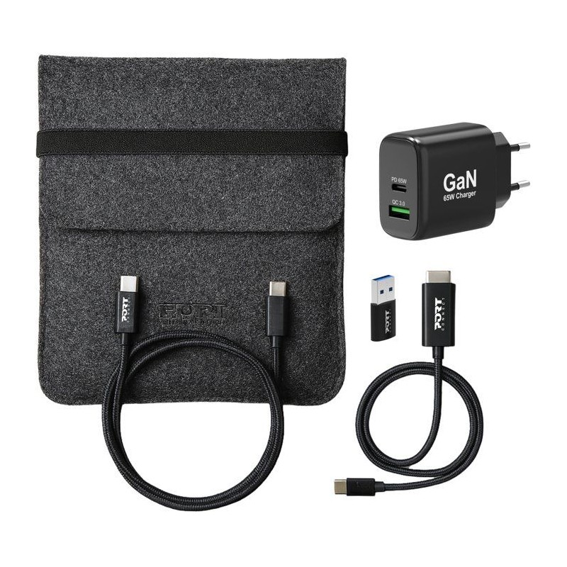 Le Pack de Démarrage 4-en-1 réunit tout ce qu'il vous faut pour charger et connecter vos appareils partout : un chargeur GaN 65W compact, un câble USB-C 1,8 m, un adaptateur USB-A/USB-C et un câble HDMI 4K UHD, le tout dans une housse de transport élégante et pratique.