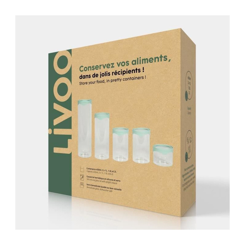 Set de 5 bocaux de conservation - LIVOO - MEN399 - 5 bocaux - 450 mL - Verre borosciliate - Couvercle en silicone et verre