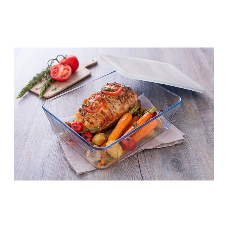 Rectangular dish with Pyrex lid Cook & Freeze: 25 * 19 cm Pyrex borosilicate glass base: -Supports extreme temperatures from -40 ° C to + 300 ° C -Resistant to thermal shock up to 220 ° C: can go from the freezer at -20 ° C in the oven at 240 ° C -Healthy and hygienic material that retains neither the stains nor the