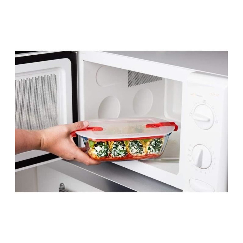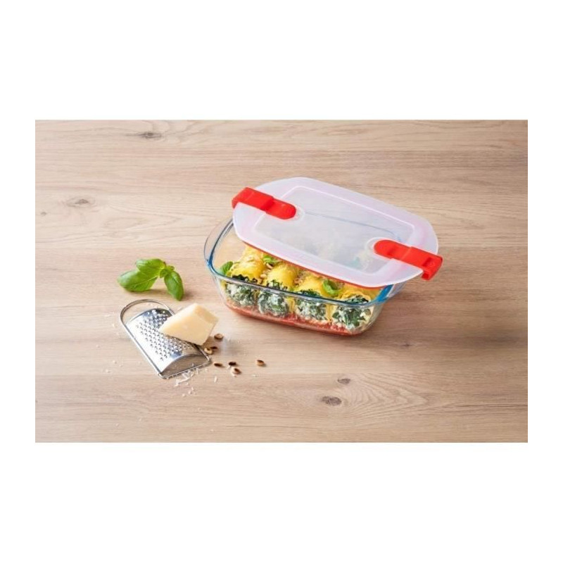 Glass rectangular dish with special Cook & Heat microwave cover: 28x20cm Borosilicate glass base: resistant to extreme temperatures, from -40 ° C to + 300 ° C, and to thermal shocks up to 220 ° C, allowing to bake (without the lid), store in the refrigerator and freezer and warm