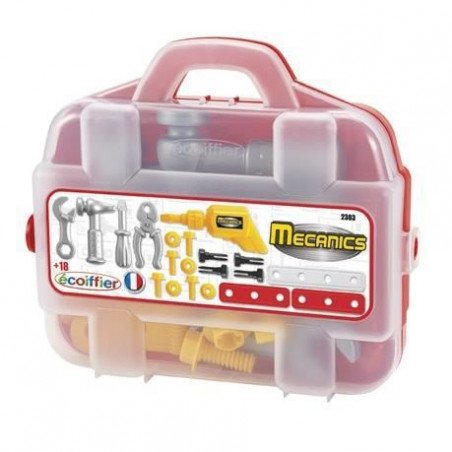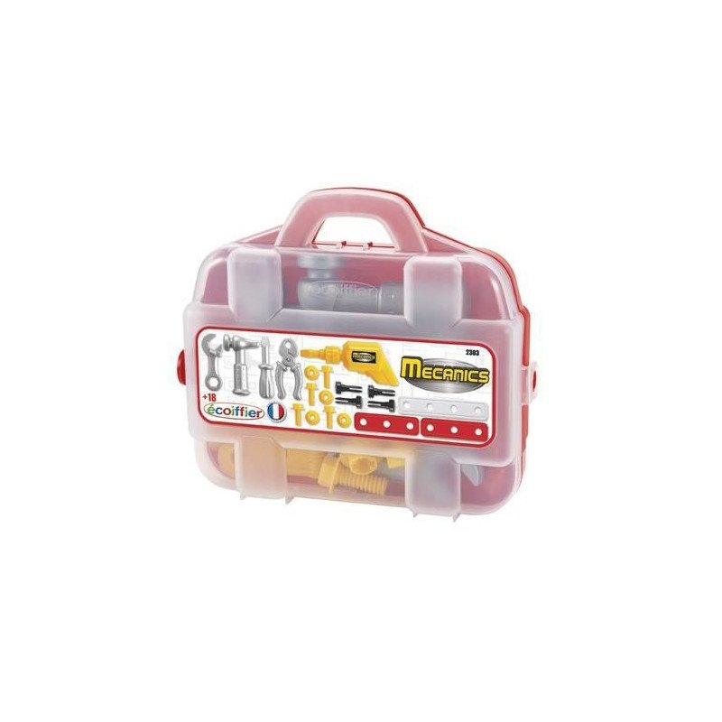Une valisette en partie transparente pour ranger les 20 accessoires indispensables a un bon mécanicien: perceuse, pince, tournevis, écrous...Fabrication Française.