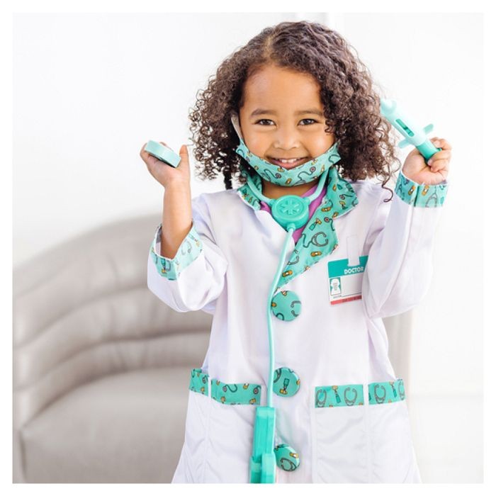 Un coffret d'imitation de docteur Melissa et Doug comprenant un déguisement et de nombreux accessoires. Déguisement réalisé dans des matériaux de qualité pour assurer sécurité et durabilité. Adapté aux enfants de 3 a 6 ans. Il comprend 8 accessoires qui aident les enfants a jouer : une veste, un masque, une seringue, un marteau pour vérifier les réflexes, un otoscope, un stéthoscope fonctionnel et une étiquette pour plus de réalisme. Veste 100% polyester. Lavable en machine. Stéthoscope fonctionnant avec 2 piles LR03 non fournies. Livré sur cintre avec protection plastique. De 3 a 6 ans.