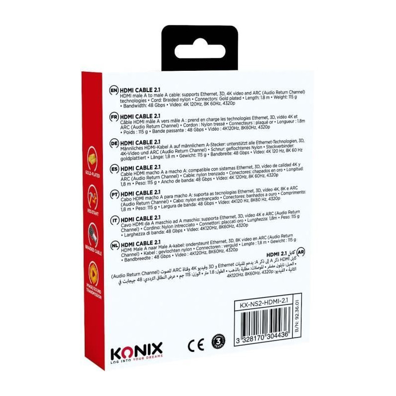 Ce câble HDMI 2.1 KONIX pour Nintendo Switch 2 offre une compatibilité 4K et 8K. Avec sa longueur de 1,8 m et son design en nylon tressé, il assure une connexion durable et de haute qualité. Idéal pour les gamers souhaitant profiter d'une expérience visuelle optimale.