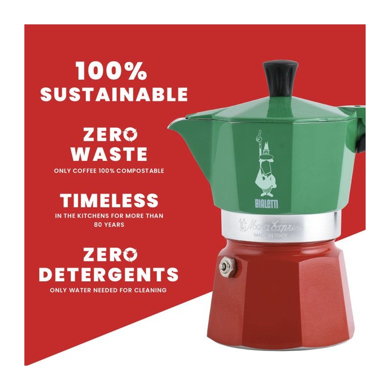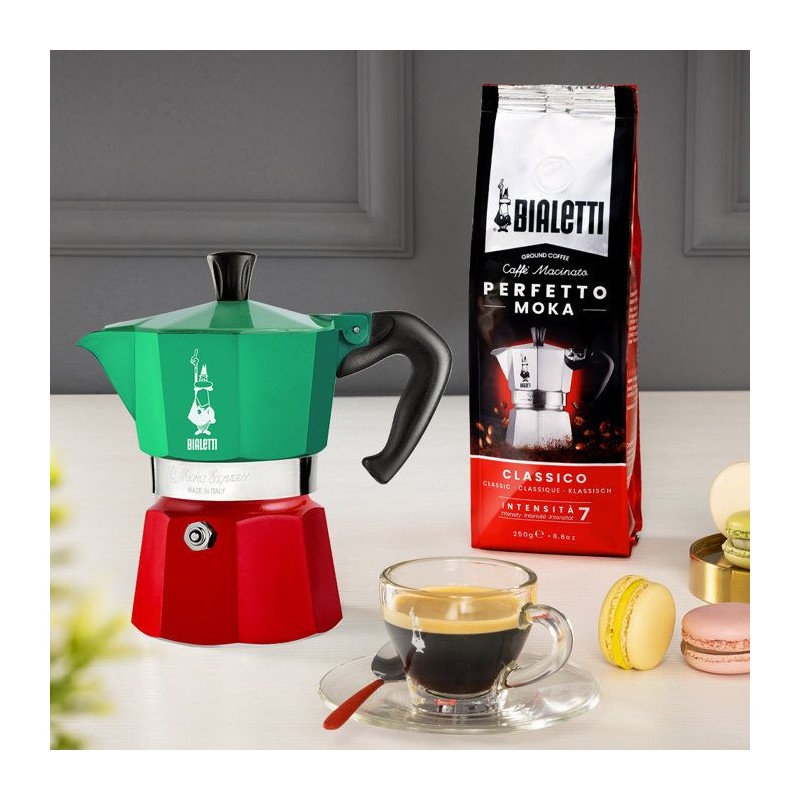 Un hommage au café italien avec la Moka Express Italia 6 tasses. Design tricolore, espresso intense et convivialité au rendez-vous.