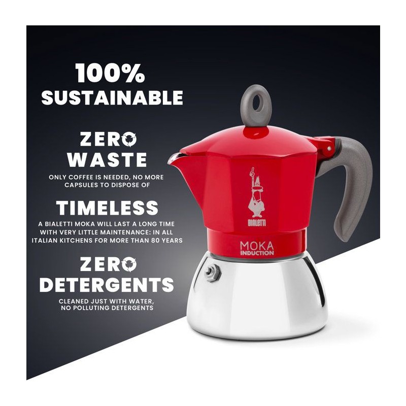 Compacte et raffinée, la MOKA Induction rouge prépare 2 tasses d'espresso sur plaque a induction. Parfaite pour les amateurs de café en solo ou en duo.