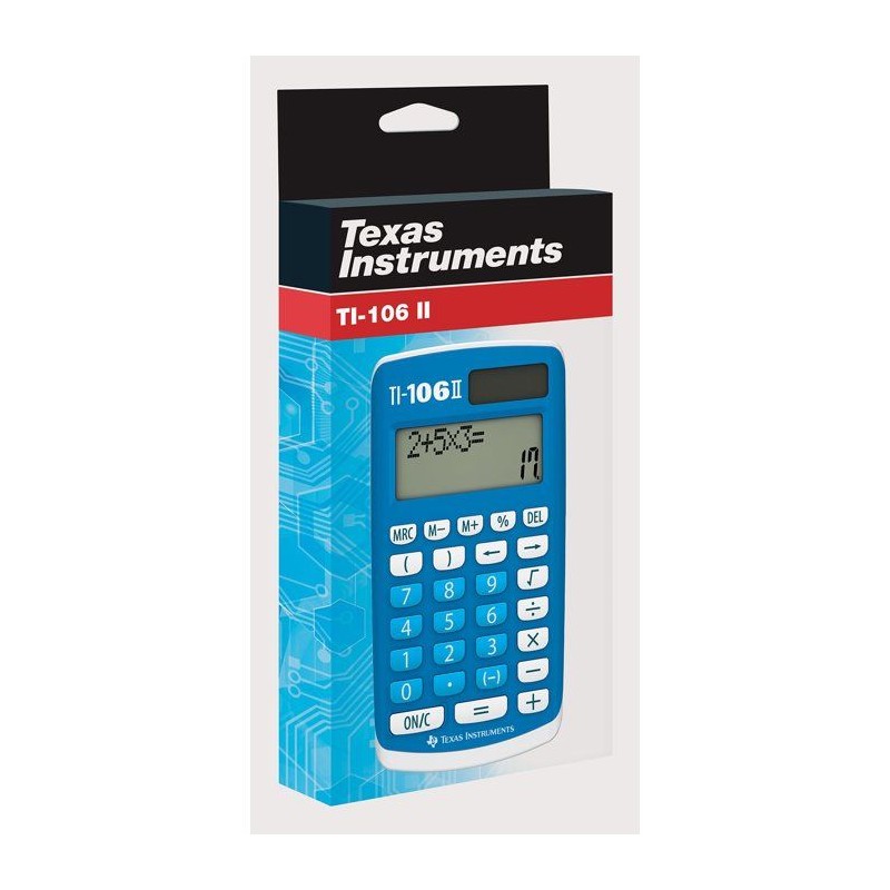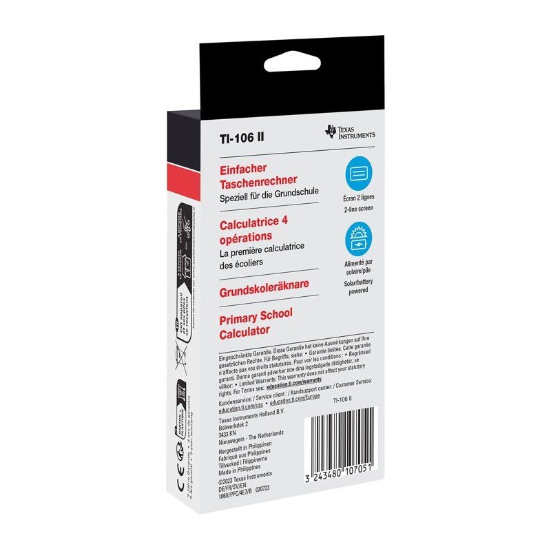 La TI-106 II est une calculatrice simple et robuste, spécialement conçue pour les éleves de l'école primaire. Adaptée a l'apprentissage des quatre opérations, elle respecte la priorité des calculs et dispose d'un écran a deux lignes permettant de visualiser simultanément l'opération et le résultat. Facile a prendre en main grâce a ses touches larges et lisibles, elle accompagne efficacement les enfants dans leurs premiers apprentissages mathématiques. Son capot de protection intégré assure une excellente résistance aux chocs du quotidien, tandis que son alimentation solaire avec batterie de secours garantit une utilisation durable. Fiable, intuitive et pensée pour le milieu scolaire, la TI-106 II est un choix sûr pour un apprentissage serein des bases du calcul.