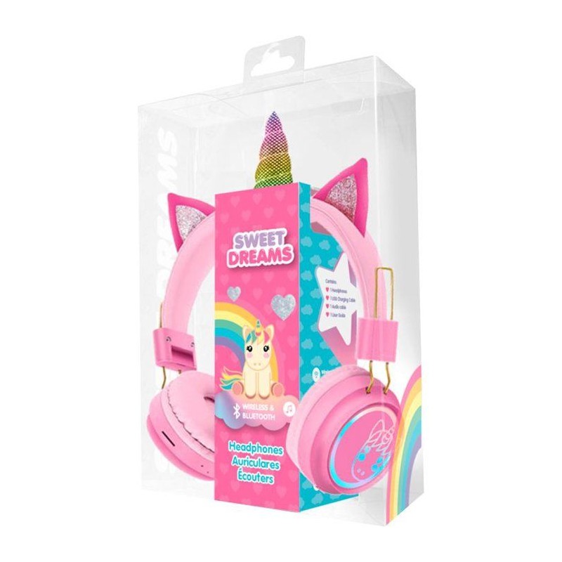 Magnifique casque Bluetooth Sweet Dreams. Tu peux le personnaliser avec la corne et les oreilles de licorne. Aussi, les écouteurs s'allument. La durée d'autonomie est de 18 heures. Fonctionne avec batterie rechargeable incluse.