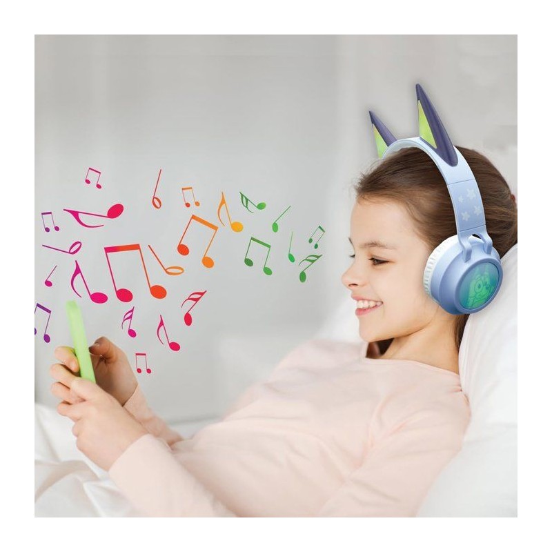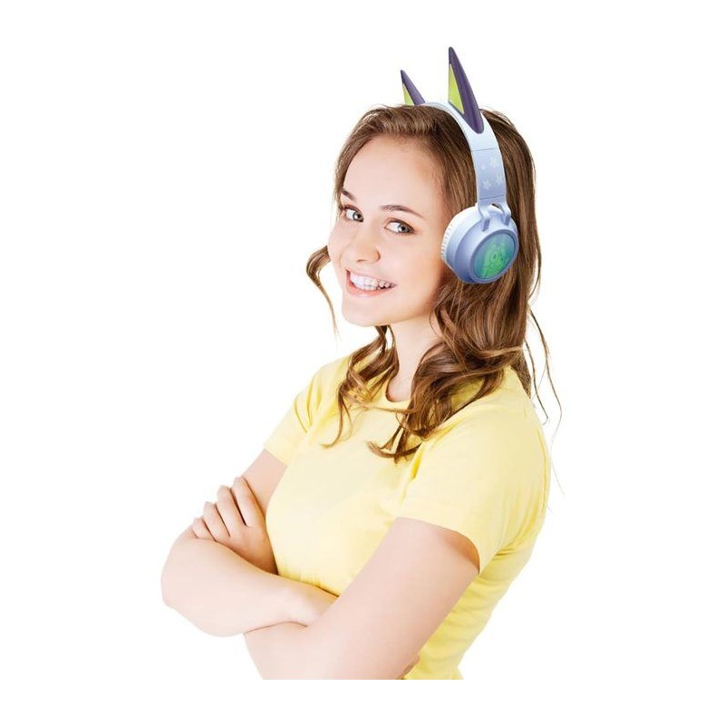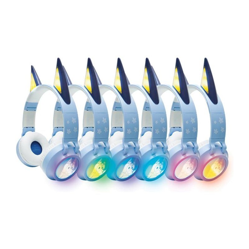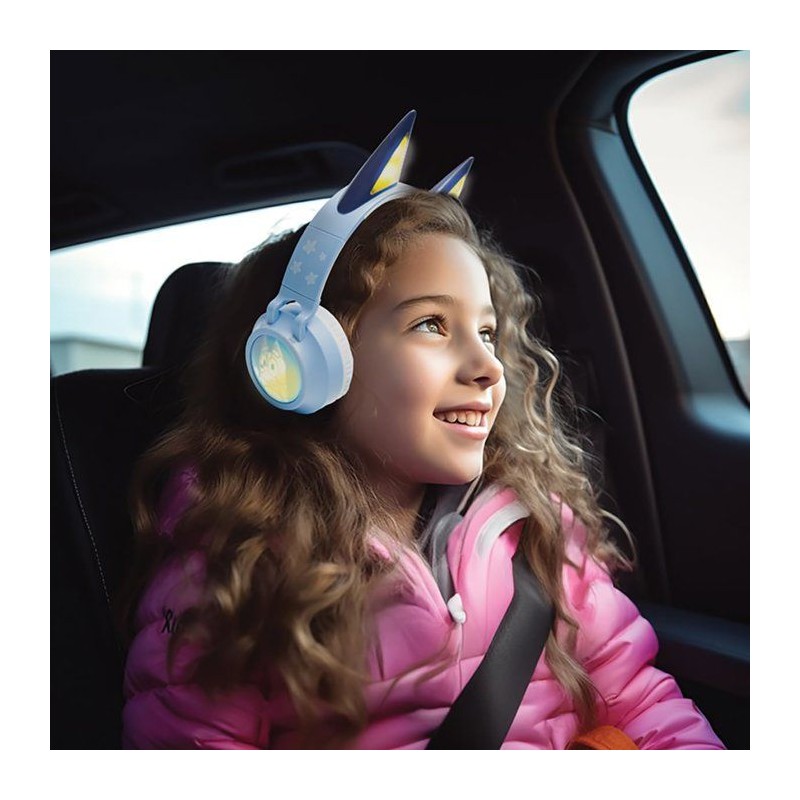 Magnifique Casque en 3D Bluey, sans fil, rechargeable et lumineux *Casque audio 2-en-1 pour écouter votre musique sans fil en Bluetooth® 5.3 (jusqu'a 10m de portée) ou branché avec le câble aux in amovible (inclus). *Avec microphone intégré, boutons de lecture/pause, mode et volume pour contrôler votre musique et répon