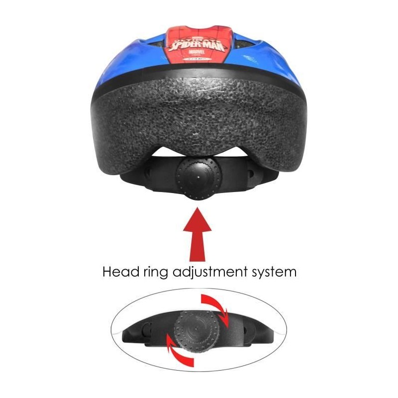 STAMP - MARVEL - SPIDERMAN Helmet + Elbow pads / Knee guards - Adjustable head circumference with head rign wheel system for comfort and maintenance. 50 / 56cm. Adjustable jugular straps. Vents. Internal foam for comfort. EPS structure - Gar