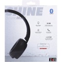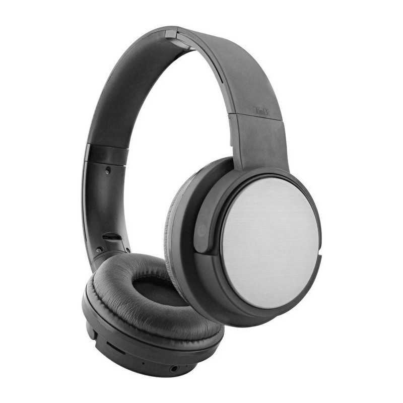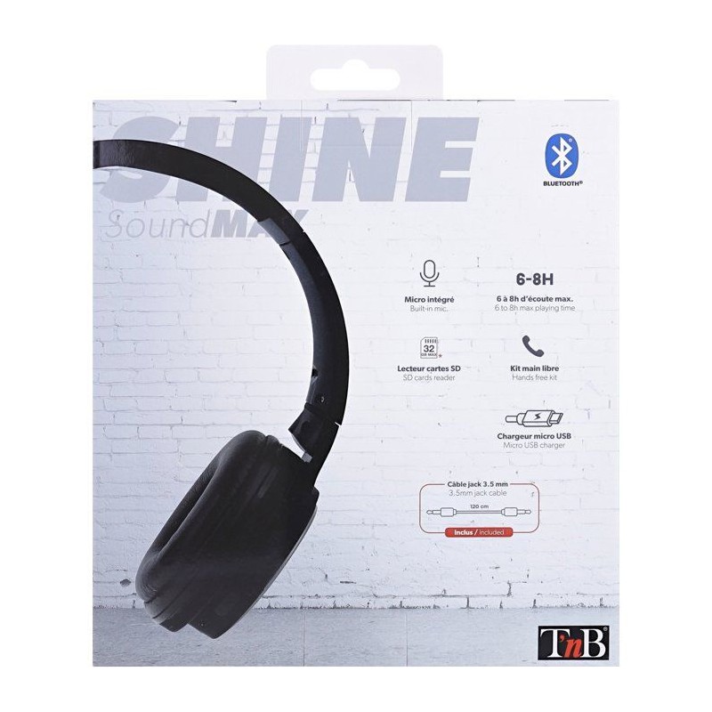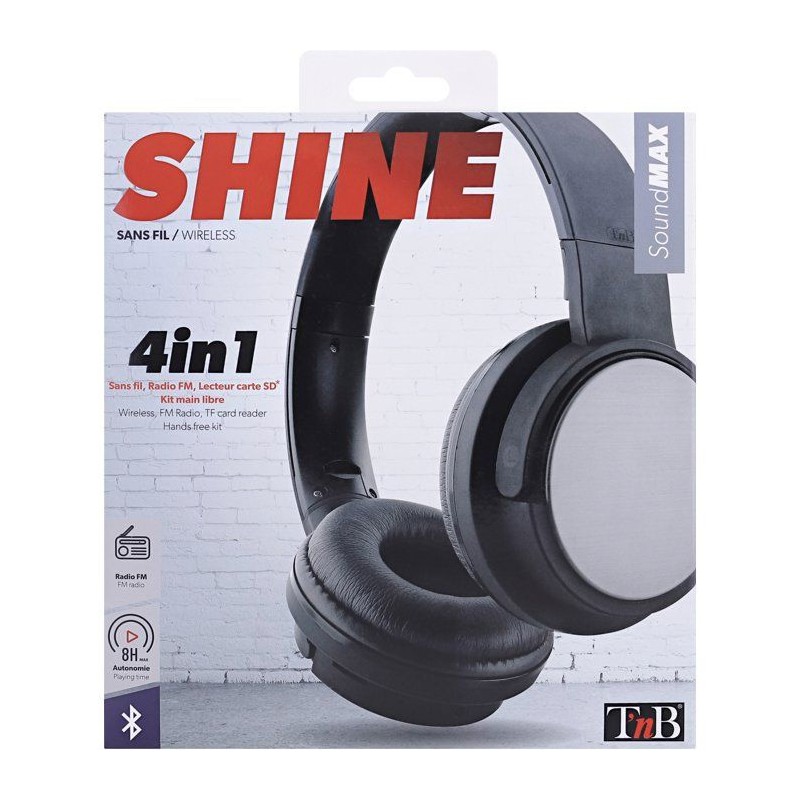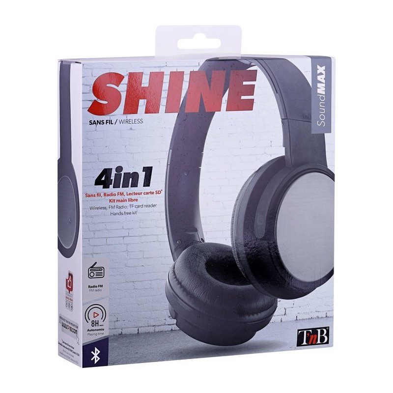 Casque bluetooth "SHINE" NOIR Un concentré de technologies associé a un style tendance et discret grâce a ses pads texturés acier brossé. Retrouvez 4 fonctionnalités en un seul casque, pour une utilisation complete et variée, pensée pour la vie quotidienne : - Bluetooth (sans fil) - Filaire (câble auxiliaire inclus) - Lecteur de carte micro-SD intégré - Radio FM Casque pliable, arceau rembourré et réglable en hauteur, et coussinets ultra-confort pour une qualité d'écoute optimisée. Le nouveau casque SHINE de T'nB : le casque Bluetooth "full options" le plus complet du marché !