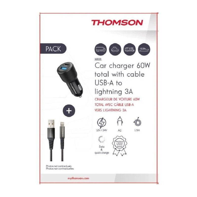Ce pack THOMSON inclut un chargeur de voiture de 60 W et un câble USB-A vers L, idéal pour recharger rapidement vos appareils compatibles USB. Compact et léger, il est parfait pour une utilisation en déplacement.