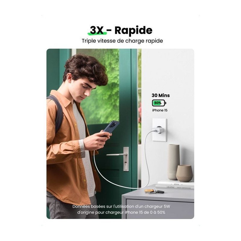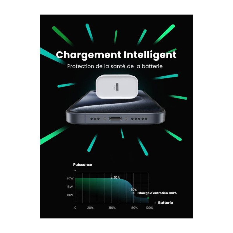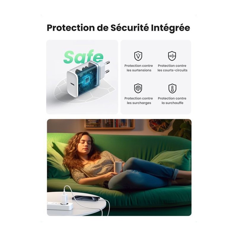 Le chargeur secteur UGREEN 20W avec port USB-C est un petit bijou de performance et de praticité. Sa puissance de 20W permet une recharge rapide et sécurisée des smartphones et tablettes compatibles USB-C PD. Compact et léger, il se glisse facilement dans une poche ou un sac pour un usage nomade. Son design blanc élégant et minimaliste s'adapte a tous les environnements. Avec des protections contre la surcharge, la surchauffe et les courts-circuits, ce chargeur garantit la sécurité de vos appareils tout en offrant une solution de recharge efficace au quotidien.