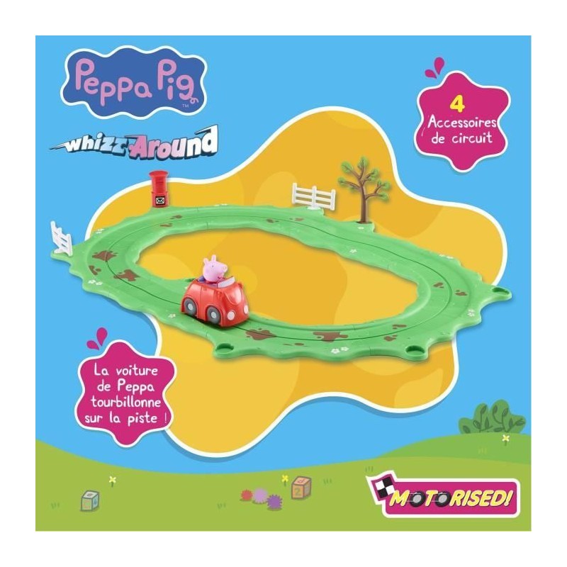 Bandai est un groupe japonais incontournable dans l'univers des jouets depuis 1981. En France, Bandai fait rever les enfants en melant créativité et émotion, personnages cultes de dessins animés et innovations : Dragon Ball, Miraculous, One Piece, Naruto et bien sûr Tamagotchi... Ce sont mille mondes merveilleux de jouets de fantaisie et d'action qui s'ouvrent pour chaque génération d'enfants ! Peppa Pig est l'amie préférée des tout-petits ! Avec ses aventures amusantes, ses personnages attachants et son univers coloré, Peppa encourage les enfants a explorer, imaginer, apprendre... tout en s'amusant. Des jouets a l'image de la série pour revivre leurs épisodes préférés a la maison ! Ce superbe coffret Whizz Around permet aux enfants de recréer les aventures préférées de Peppa sur un circuit amusant et coloré. La voiture tourbillonne toute seule autour de la piste pendant que Peppa profite de la promenade !