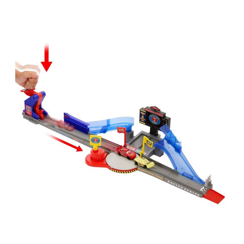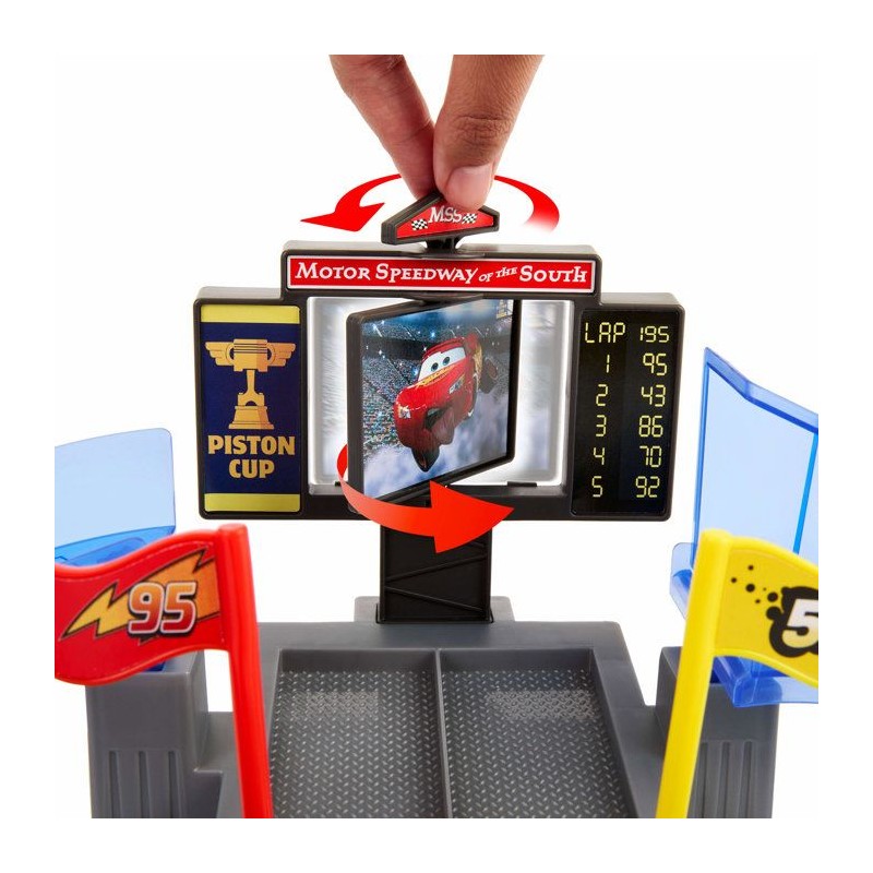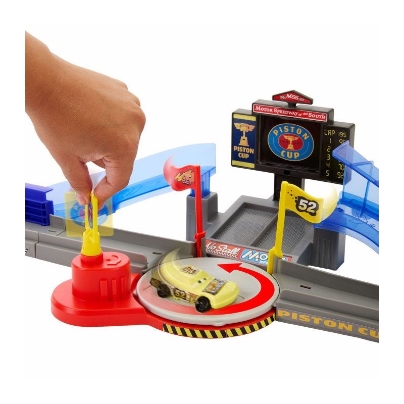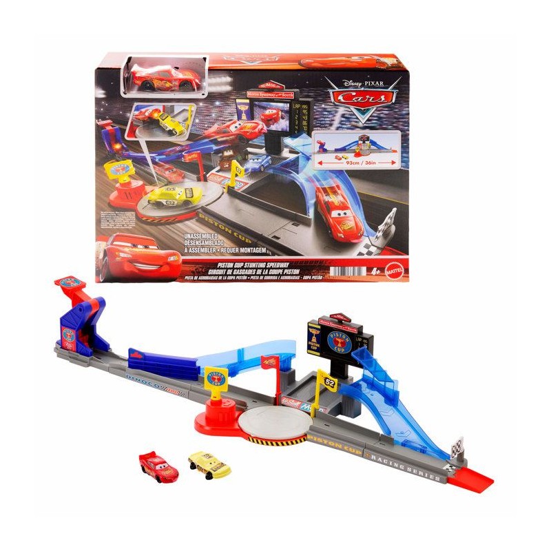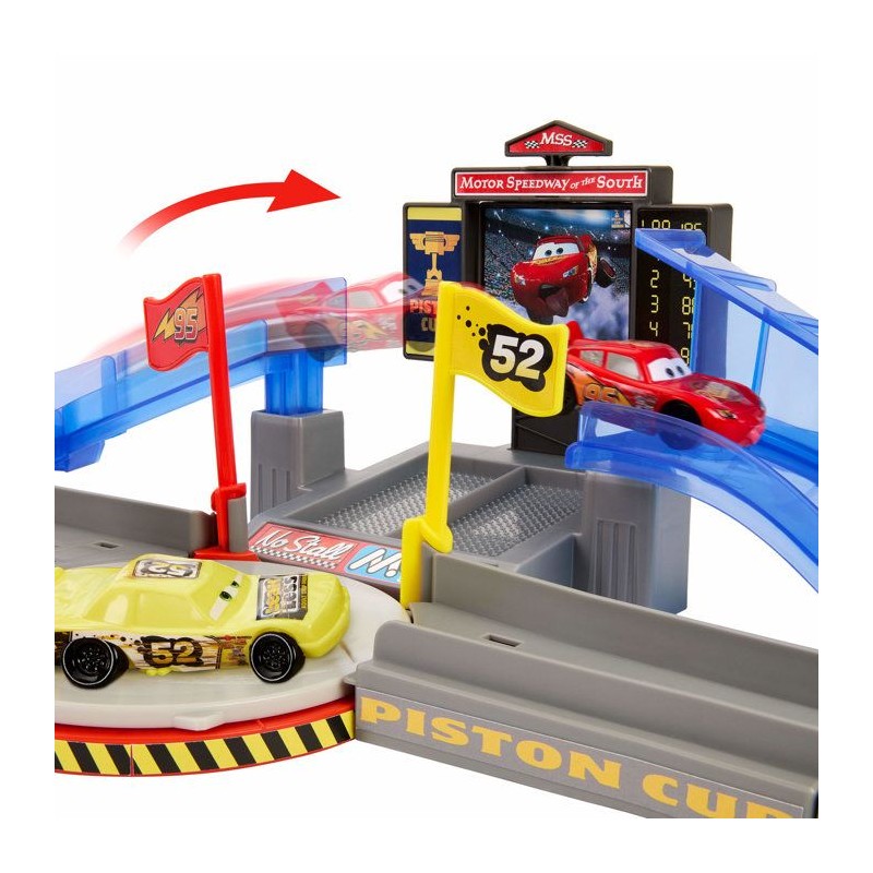 Circuit de la scene iconique du film Cars, affichage interactif et plusieurs routes, 2 véhicules die cast inclus