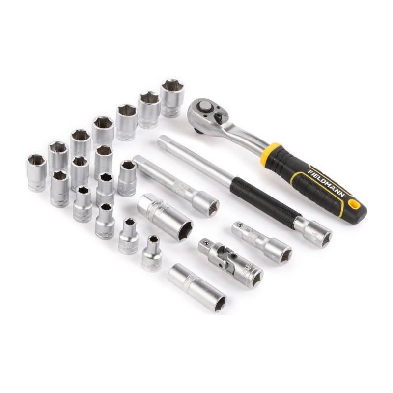 Le jeu de clés a douille Fieldmann FDG 5022-23R comprend 23 pieces, dont un cliquet 1/2" a 72 dents, des douilles de 8 a 24 mm, et des rallonges. Pratique et organisé, ce coffret en plastique dur est idéal pour votre garage ou atelier.
