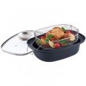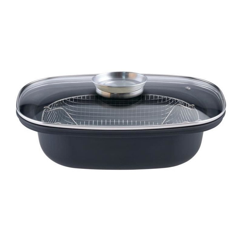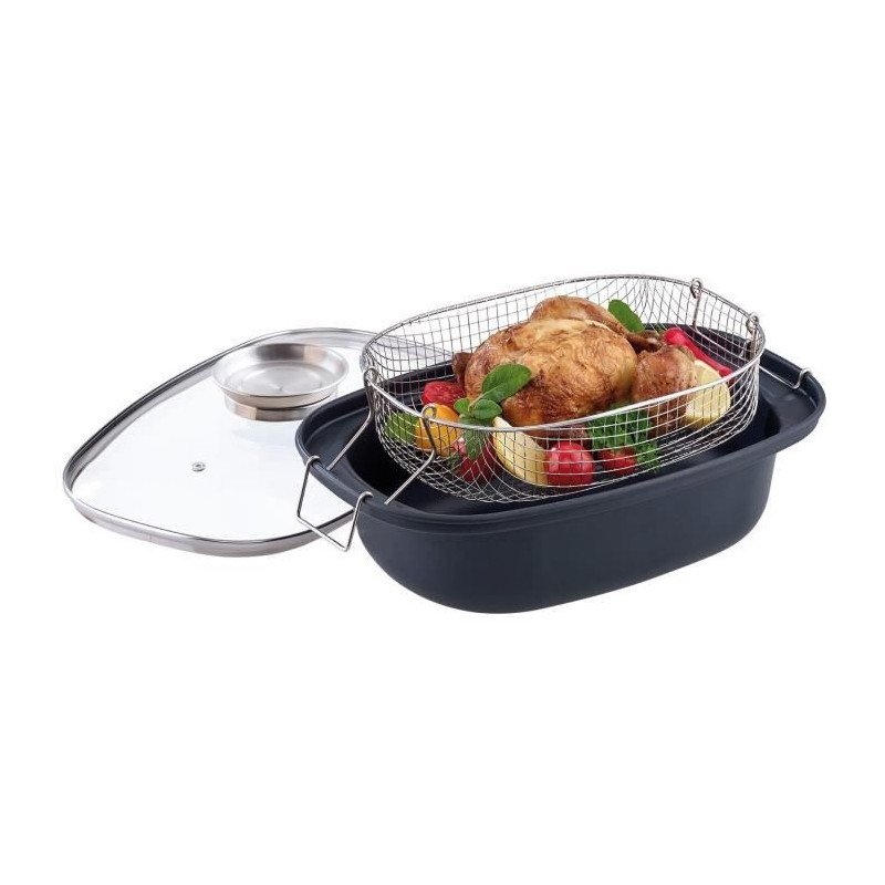 Cocotte 40 x 25 cm - Acier carbone massif - Revetement antiadhésif tres robuste - Permet de braiser, dorer et étuver - Couvercle 32 x 32 cm en verre Arôme pour goutte a goutte - Panier inox 4l pour frire et étuver - Passe au four jusqu'a 240°C - Tous feux dont induction