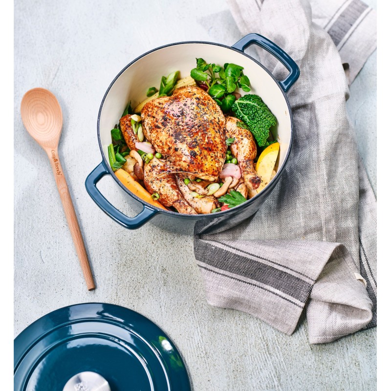 La cocotte Fontestic est un must pour tout amateur de cuisine qui aime les ragoûts et les plats mijotés. Cette cocotte de 24 cm de diametre est conçue en fonte de haute qualité et durable et possede un intérieur lisse et émaillé blanc. Les couvercles sont dotés de droplets : de petites broches qui répartissent uniformément le liquide de cuisson a l'intérieur de la cocotte, ce qui permet d'obtenir des plats délicieusement juteux. La série Fontestic peut etre utilisée sur toutes les plaques de cuisson et au four jusqu'a 200 °C. Grâce aux propriétés fantastiques de cette marmite, vous pourrez servir des rôtis tendres et de délicieux ragoûts en un rien de temps. Pour prolonger la durée de vie du produit, nous vous recommandons de le laver a la main. Disponible en 3 magnifiques couleurs : Mer (bleu profond), Terre (rouille) et Soleil (ambre).