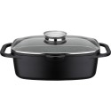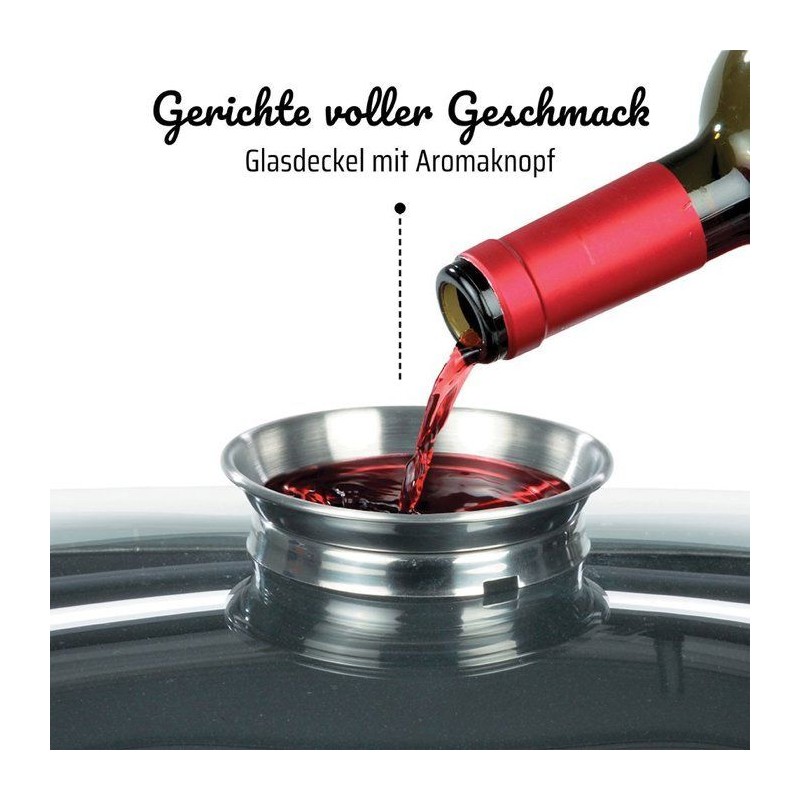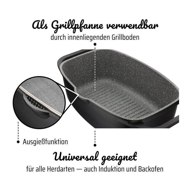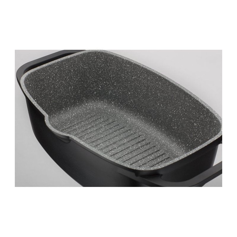 Induction cocotte with GRANIT multilayer non-stick coating - Grill bottom and lid with filtering grid - AROMA lid for dampening - High quality aluminum cast iron.