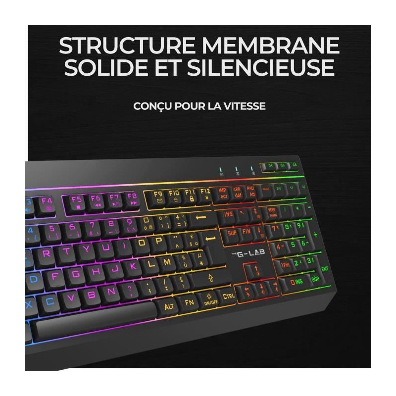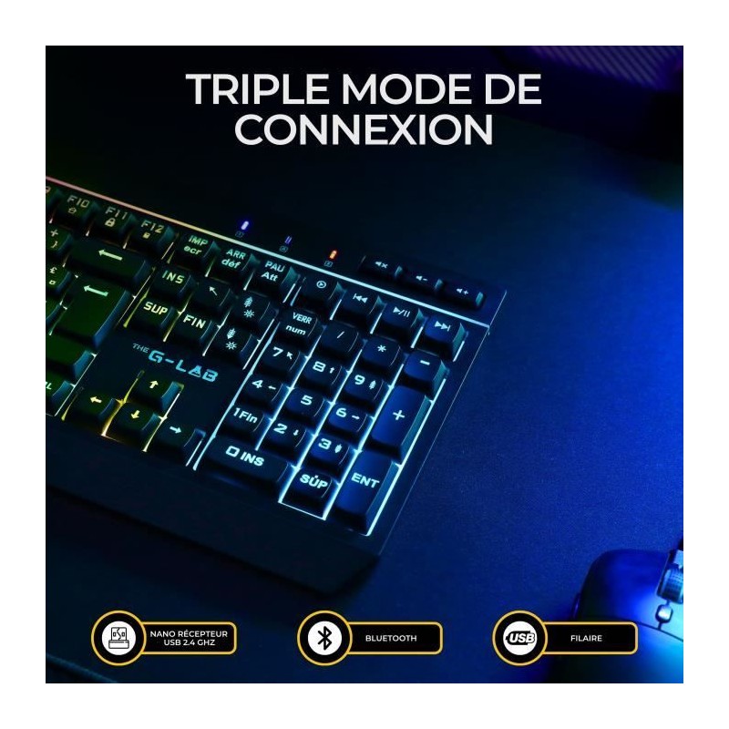 Découvrez le Clavier Gamer Sans Fil - KEYZ TUNGSTEN EX de The G-Lab, un clavier spécialement conçu pour offrir aux joueurs un maximum de confort, de performance et de liberté. Grâce a sa technologie sans fil 2,4 GHz ultra-stable, profitez d'une connexion rapide et sans latence, idéale pour les sessions de jeu les plus intenses. Plus de câbles qui encombrent le bureau : place a une installation claire, moderne et pratique. Le KEYZ TUNGSTEN EX adopte un format compact et ergonomique, optimisé pour libérer de l'espace tout en gardant toutes les touches indispensables. Sa frappe fluide et réactive garantit un contrôle total lors de vos parties, que ce soit pour des jeux rapides demandant précision ou pour de longues sessions multijoueurs. Son design robuste assure une durabilité optimale, meme en cas d'utilisation intensive. Côté personnalisation, le clavier integre un rétroéclairage multicolore avec plusieurs effets lumineux, pour une immersion totale et un style affirmé. Jouez dans l'obscurité sans difficulté et adaptez l'ambiance a vos envies. Ce rétroéclairage apporte également une meilleure lisibilité des touches en toute circonstance. Pensé pour le gaming mais aussi adapté a la bureautique, le KEYZ TUNGSTEN EX est polyvalent et pratique. Son autonomie longue durée vous permet d'enchaîner les heures de jeu sans vous soucier de la recharge. Léger et compact, il se transporte facilement et devient un allié idéal pour les gamers nomades. Avec ce clavier, The G-Lab propose une solution efficace et abordable pour profiter d'un setup sans fil performant, moderne et confortable. Le KEYZ TUNGSTEN EX est le choix parfait pour les joueurs PC a la recherche de fiabilité, de rapidité et d'esthétique. Que vous soyez compétitif ou joueur occasionnel, ce clavier sans fil est conçu pour vous donner la liberté et la précision nécessaires pour atteindre vos objectifs et remporter la victoire.