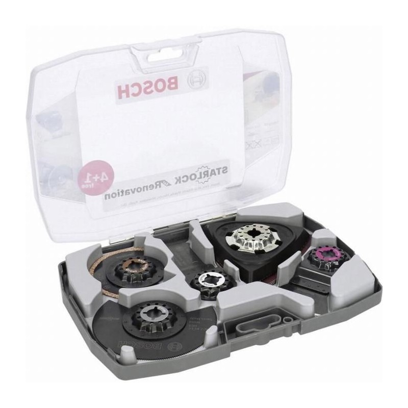 Disponible a partir de décembre 2021 Starlock for Renovation 4+1 1x AIZ 32 APB, 1x ACZ 85 EC, 1x ACZ 70 RT5, 1x ATZ 52 SC, 1x AVZ 93 G 6x feuille a poncer Jeu de lames de scie adapté aux: Résine époxy, Couleur, peinture, Fibro-ciment, Colles a carrelage, Bois, En plastique, Mortier Largeur de travail pour les coupes, pour les coupes en plongée