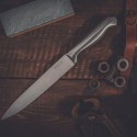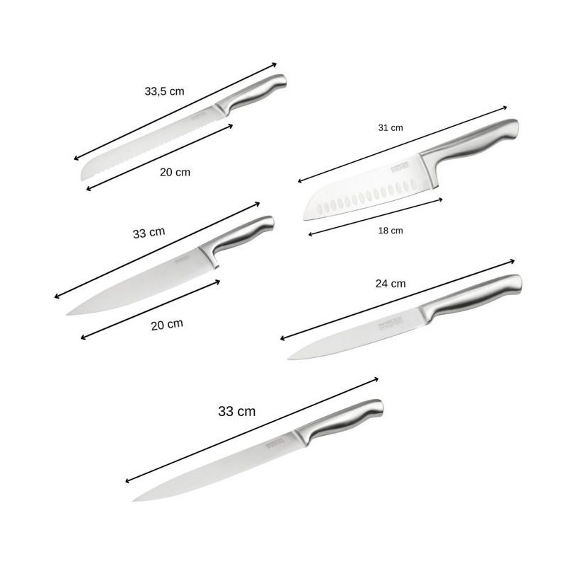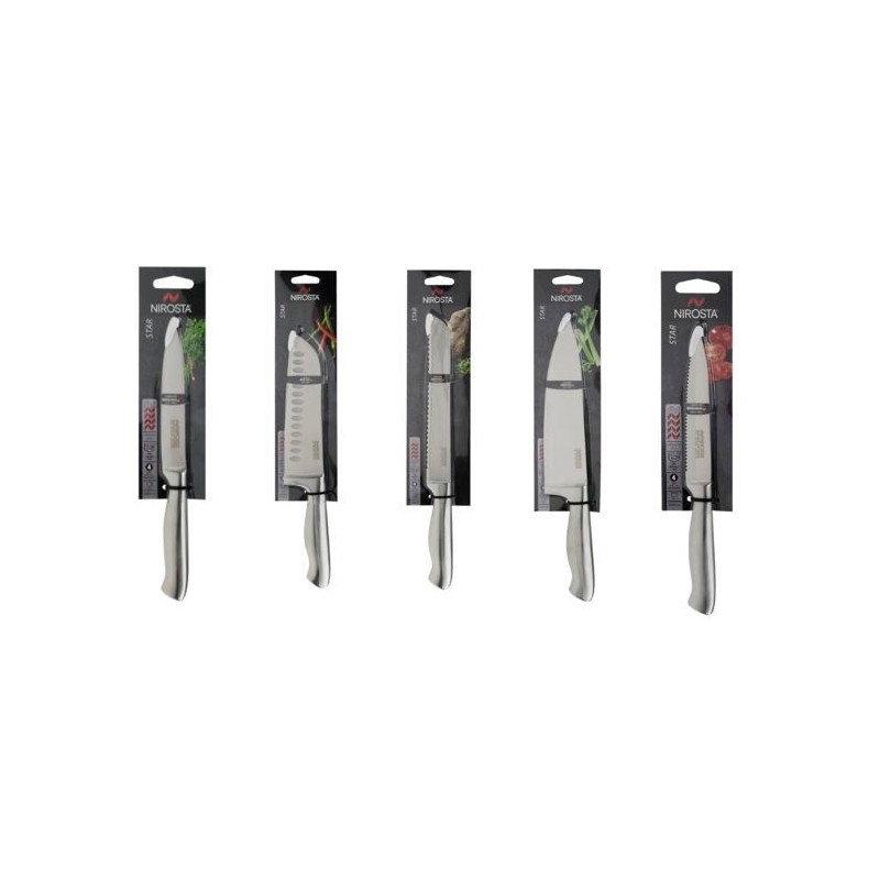 LE PETIT + : Les couteaux de cuisine sont formés d'une seule piece en acier inoxydable ce qui leur donne une tres grande résistance, une grande précision de découpe et un design sobre et élégant qui se fond a merveille dans toutes les cuisines. COMPOSITION : Cet ensemble est en acier inoxydable et pour l'entretien, c'est tres de l'eau et du savon, pour les garder longtemps a ne pas les mettre au lave-vaisselle. DIMENSIONS : Couteau cranté : 24 cm, lame 12 cm | Couteau de chef : 33 cm, lame 20 cm | Couteau a pain : 33,5, lame 20 cm | couteau santoku : 31 cm, lame 18 cm | Couteau universel : 24 cm, lame 12 cm CONTENU : 1 couteau cranté + 1 couteau de chef + 1 couteau a pain + 1 couteau santoku + 1 couteau universel Depuis des décennies, la marque traditionnelle Nirosta fabrique des couteaux, des couverts et des ustensiles de cuisine en acier inoxydable de haute qualité. La gamme propose des couteaux de haute qualité pour les professionnels et un programme complet de couteaux de cuisine et de ménage bon marché.   Aujourd'hui, plus que jamais, nous considérons la cuisine comme un espace de vie. Non seulement le travail et la préparation se font ici, mais la cuisine est au centre du foyer et constitue un lieu de partage pour la famille et les amis, un lieu où l'on vit le plaisir. Nirosta vous propose ce set de 5 couteaux de la collection Star. Les couteaux sont fabriqués en acier inoxydable japonais de haute qualité et ont une lame particulierement tranchante. La mitre élaborée offre une protection supplémentaire pour vos doigts lors de la découpe. Grâce a la finition sans joint , les couteaux sont particulierement hygiéniques et faciles a nettoyer a la main apres utilisation.