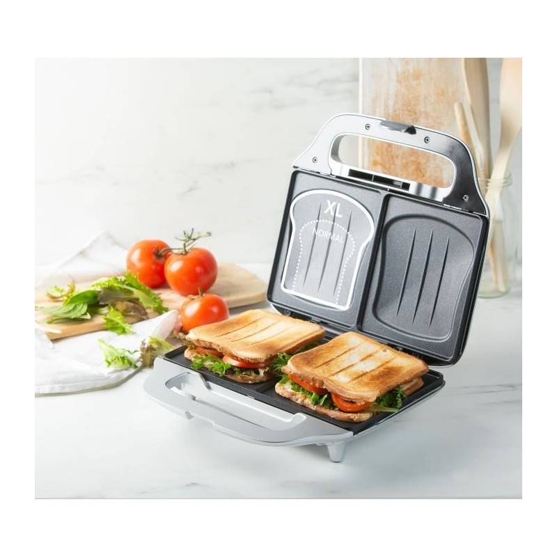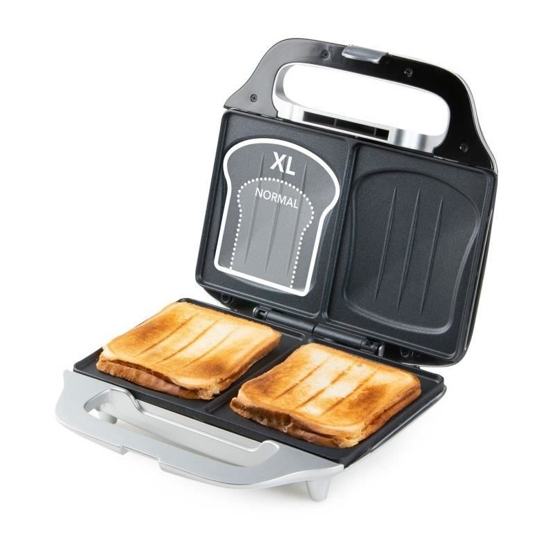 Appareil a croque-monsieur avec plaques de cuisson antiadhésives, idéal pour préparer 2 croques XL de 25 x 15 cm en un clin d'oeil grâce a sa puissance de 900W.