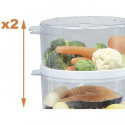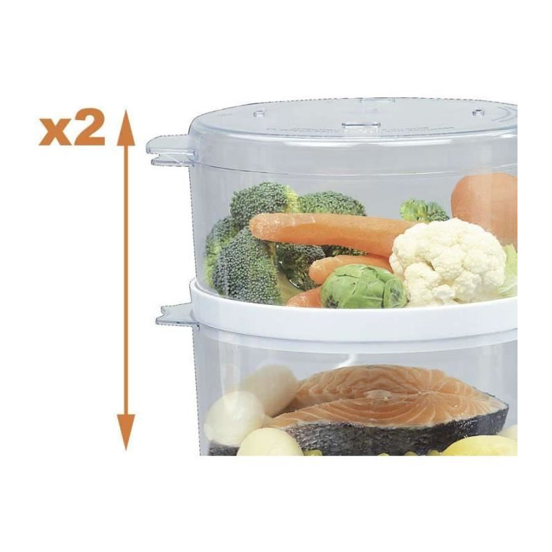 220-240V ~ 50Hz · Minuterie de 60 minutes, rappel sonore inclus · Couvercles et plateaux amovibles · Deux hauteurs pour double capacité · 4.4 L · Idéal pour cuisiner sain et préparer tout type de plat a la vapeur · Profitez d'un repas sain et savoureux tout en préservant les vitamines des aliments · Préparez des plats élaborés en un temps record et sans le moindre désordre · Voyant lumineux indicatif "pret a cuire".