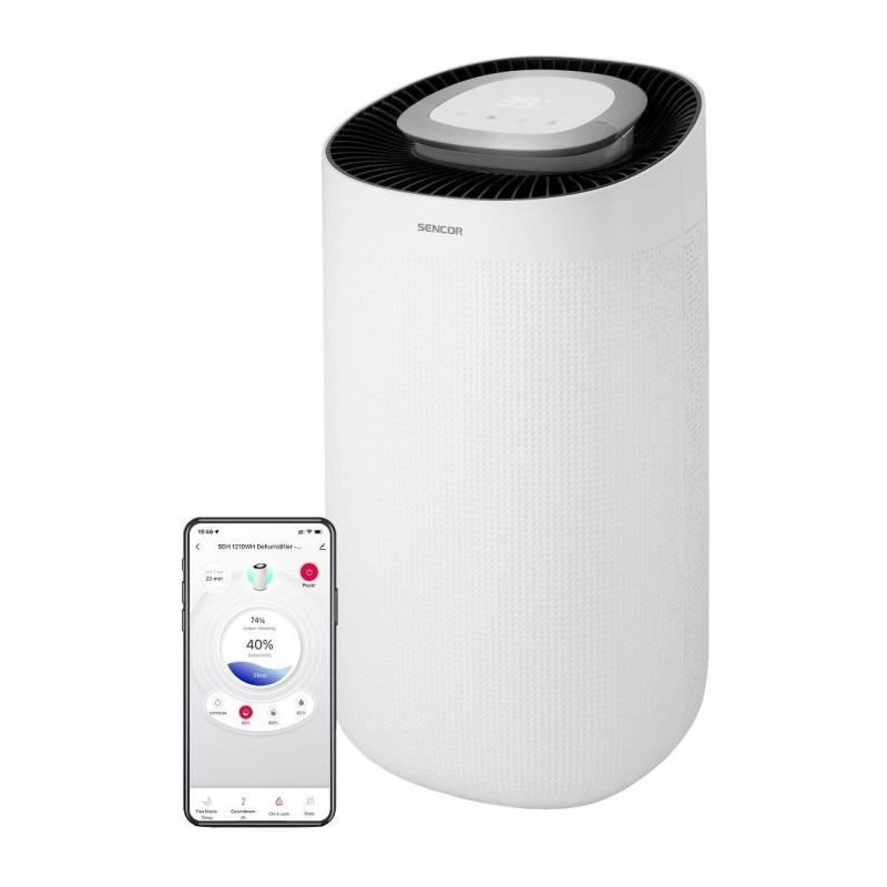 Le déshumidificateur Sencor SDH 1210WH élimine jusqu'a 12 l d'humidité par jour. Il est équipé d'un filtre HEPA H11 pour purifier l'air et d'un contrôle via l'application Sencor HOME. Idéal pour des pieces de 18 a 30 m², il dispose de 4 réglages de déshumidification, d'une minuterie et d'un mode dégivrage automatique.