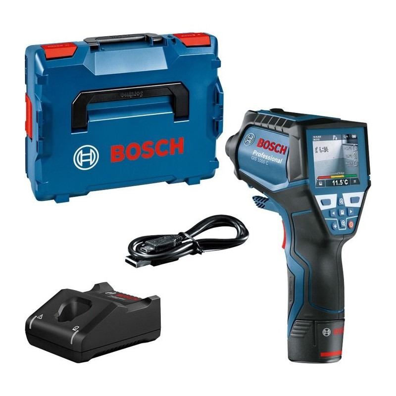 Détecteur thermique Bosch Professional GIS 1000 C avec batterie 12V 2,0Ah, carte Quickstart, cable USB, en L-Boxx - 0601083301