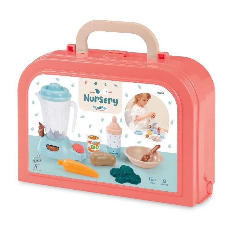 Cette valisette repas de bébé d'ECOIFFIER contient tout le nécessaire pour imiter les repas : un robot mixeur, un biberon, un yaourt, une assiette, une cuillere et des légumes. Un jeu d'imitation parfait pour stimuler l'imagination et la motricité fine des enfants a partir de 18 mois.