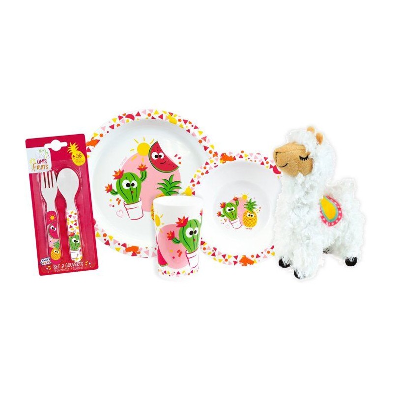 Cet ensemble de vaisselle Les Amis Fruits fera fondre les enfants grâce a ses couleurs joyeuses et a sa peluche Lama toute douce. Il contient une assiette creuse Ø16 cm, une assiette plate Ø22 cm, un verre 220 ml et des couverts adaptés aux petites mains. Réutilisable, facile d'entretien et compatible lave-vaisselle, il accompagne votre enfant a chaque repas. La peluche 27 cm devient un compagnon adorable, idéal pour rassurer et jouer. Une création française pensée pour un cadeau utile et plein de tendresse !